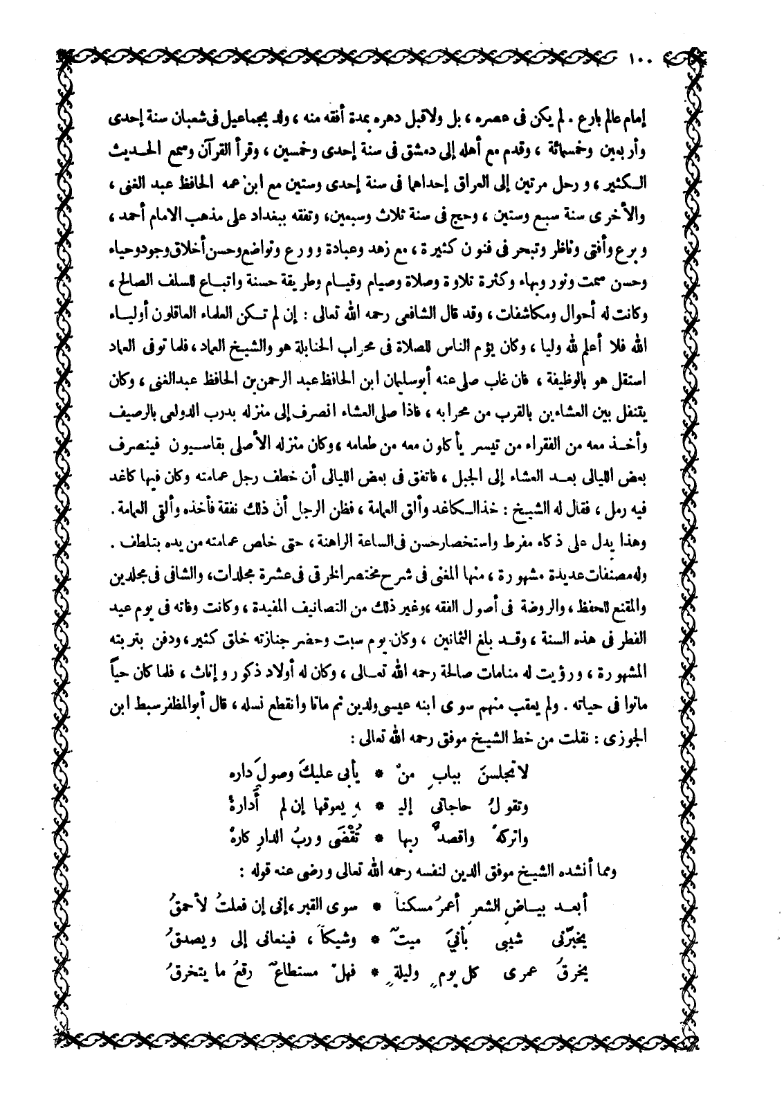 وَمِمَّا أَنْشَدَهُ الشَّيْخُ مُوَفَّقُ الدِّينِ لِنَفْسِهِ رَحِمَهُ اللَّهُ تَعَالَى وَرَضِيَ عَنْهُ قَوْلُهُ: