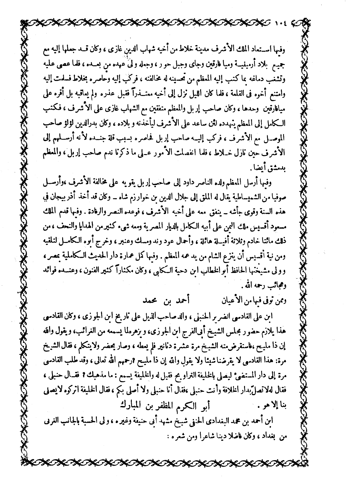 ابن عَلِيٍّ الْقَادِسِيُّ الضَّرِيرُ الْحَنْبَلِيُّ، وَالِدُ صَاحِبِ الذَّيْلِ على تاريخ ابن الجوزي، وكان الْقَادِسِيُّ هَذَا يُلَازِمُ حُضُورَ مَجْلِسِ الشَّيْخِ أَبِي الفرج ابن الْجَوْزِيِّ، وَيُزْهِرُهُ لِمَا يَسْمَعُهُ مِنَ الْغَرَائِبِ، وَيَقُولُ وَاللَّهِ إِنَّ ذَا مَلِيحٌ، فَاسْتَقْرَضَ مِنْهُ الشَّيْخُ مَرَّةً عَشَرَةَ دَنَانِيرَ فَلَمْ يُعْطِهِ، وَصَارَ يَحْضُرُ وَلَا يَتَكَلَّمُ، فَقَالَ الشَّيْخُ مَرَّةً: هَذَا الْقَادِسِيُّ لَا يُقْرِضُنَا شَيْئًا وَلَا يَقُولُ وَاللَّهِ إِنَّ ذَا مَلِيحٌ؟ رَحِمَهُمُ اللَّهُ تَعَالَى، وَقَدْ طُلِبَ الْقَادِسِيُّ مَرَّةً إِلَى دَارِ الْمُسْتَضِيءِ لِيُصَلِّيَ بِالْخَلِيفَةِ التَّرَاوِيحَ فَقِيلَ لَهُ وَالْخَلِيفَةُ يَسْمَعُ: مَا مَذْهَبُكَ؟ فقال حنبلي، فقال لَهُ لَا تُصَلِّ بِدَارِ الْخِلَافَةِ وَأَنْتِ حَنْبَلِيٌّ، فَقَالَ أَنَا حَنْبَلِيٌّ وَلَا أُصَلِّي بِكُمْ، فَقَالَ الْخَلِيفَةُ اتْرُكُوهُ لَا يُصَلِّي بِنَا إِلَّا هُوَ