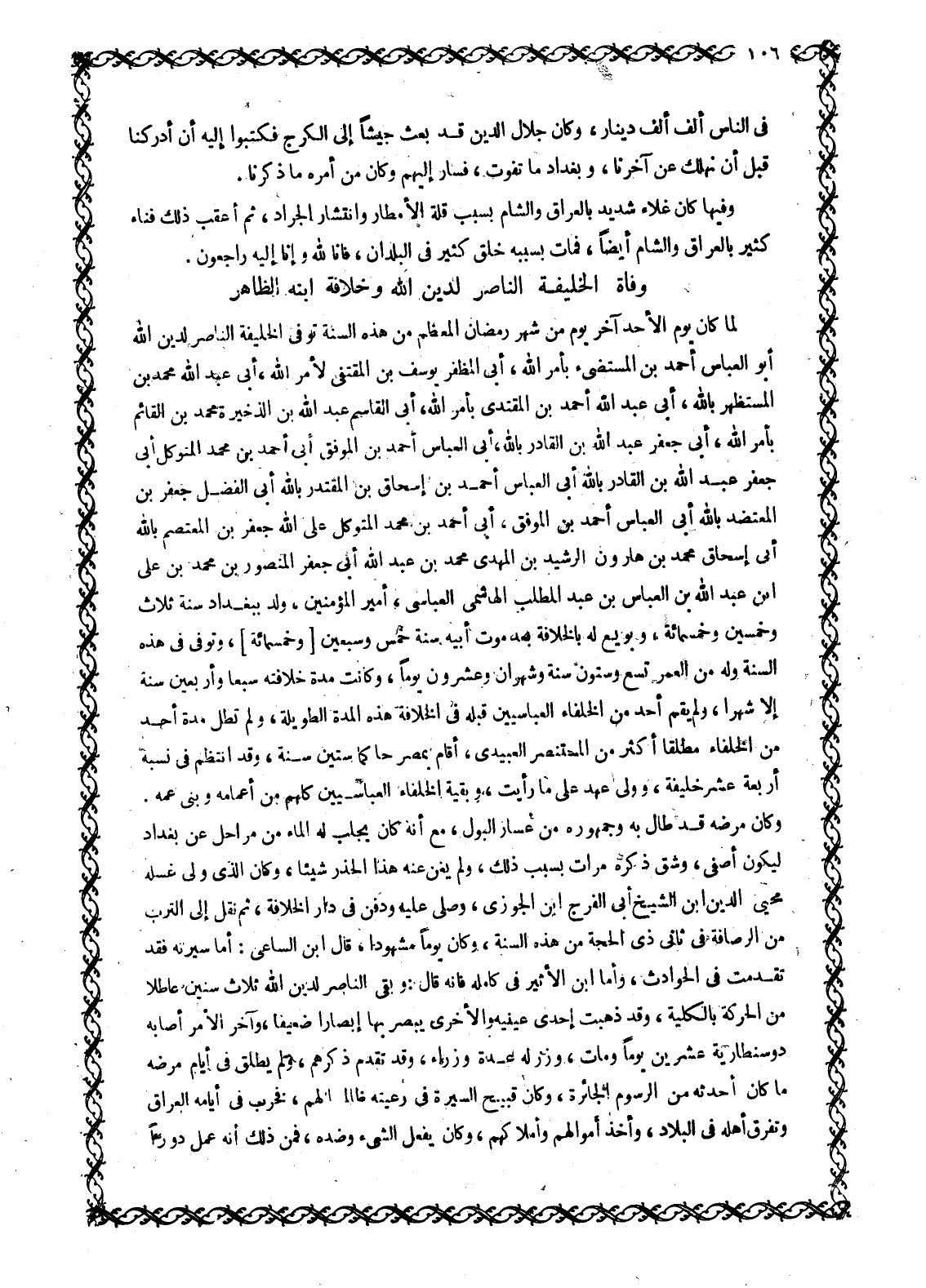 لَمَّا كَانَ يَوْمُ الْأَحَدِ آخِرَ يَوْمٍ مِنْ شَهْرِ رَمَضَانَ الْمُعَظَّمِ مِنْ هَذِهِ السَّنَةِ تُوُفِّيَ الْخَلِيفَةُ النَّاصِرُ لِدِينِ اللَّهِ أَبُو الْعَبَّاسِ أَحْمَدُ بْنُ الْمُسْتَضِيءِ بِأَمْرِ اللَّهِ، أَبِي الْمُظَفَّرِ يُوسُفَ بْنِ الْمُقْتَفِي لِأَمْرِ اللَّهِ، أَبِي عَبْدِ اللَّهِ مُحَمَّدِ بْنِ المستظهر باللَّه، أبى عبد الله أَحْمَدَ بْنِ الْمُقْتَدِي بِأَمْرِ اللَّهِ، أَبِي الْقَاسِمِ عَبْدِ اللَّهِ بْنِ الذَّخِيرَةِ مُحَمَّدِ بْنِ الْقَائِمِ بِأَمْرِ اللَّهِ، أَبِي جَعْفَرٍ عَبْدِ اللَّهِ بْنِ الْقَادِرِ باللَّه، أَبِي الْعَبَّاسِ أَحْمَدَ بْنِ الْمُوَفَّقِ أَبِي أحمد بن محمد المتوكل أَبِي جَعْفَرٍ عَبْدِ اللَّهِ بْنِ الْقَادِرِ باللَّه أَبِي الْعَبَّاسِ أَحْمَدَ بْنِ إِسْحَاقَ بْنِ الْمُقْتَدِرِ باللَّه أَبِي الْفَضْلِ جَعْفَرِ بْنِ الْمُعْتَضِدِ باللَّه أَبِي الْعَبَّاسِ أَحْمَدَ بْنِ الْمُوَفَّقِ، أَبِي أَحْمَدَ بْنِ مُحَمَّدِ الْمُتَوَكِّلِ عَلَى اللَّهِ جَعْفَرِ بْنِ الْمُعْتَصِمِ باللَّه أَبِي إِسْحَاقَ مُحَمَّدِ بْنِ هَارُونَ الرَّشِيدِ بْنِ الْمَهْدِيِّ مُحَمَّدِ بْنِ عَبْدِ اللَّهِ أَبِي جَعْفَرٍ الْمَنْصُورِ بْنِ مُحَمَّدِ بْنِ عَلِيِّ ابن عَبْدِ اللَّهِ بْنِ الْعَبَّاسِ بْنِ عَبْدِ الْمَطْلَبِ الهاشمي العباسي، أمير المؤمنين، ولد ببغداد سَنَةِ ثَلَاثٍ وَخَمْسِينَ وَخَمْسِمِائَةٍ، وَبُويِعَ لَهُ بِالْخِلَافَةِ بعد موت أبيه سنة خمس وسبعين [وخمسمائة] ، وَتُوُفِّيَ فِي هَذِهِ السَّنَةِ وَلَهُ مِنَ الْعُمْرِ تِسْعٌ وَسِتُّونَ سَنَةً وَشَهْرَانِ وَعِشْرُونَ يَوْمًا، وَكَانَتْ مُدَّةُ خِلَافَتِهِ سَبْعًا وَأَرْبَعِينَ سَنَةً إِلَّا شَهْرًا، ولم يقم أحد من الخلفاء العباسيين قبله فِي الْخِلَافَةِ هَذِهِ الْمُدَّةَ الطَّوِيلَةَ، وَلَمْ تَطُلْ مُدَّةُ أَحَدٍ مِنَ الْخُلَفَاءِ مُطْلَقًا أَكْثَرَ مِنَ الْمُسْتَنْصِرِ الْعُبَيْدِيِّ، أَقَامَ بِمِصْرَ حَاكِمًا سِتِّينَ سَنَةً، وَقَدِ انْتَظَمَ فِي نَسَبِهِ أَرْبَعَةَ عَشَرَ خَلِيفَةً، وَوَلِيَّ عَهْدٍ عَلَى مَا رَأَيْتَ، وَبَقِيَّةُ الْخُلَفَاءِ الْعَبَّاسِيِّينَ كُلُّهُمْ مِنْ أَعْمَامِهِ وَبَنِي عَمِّهِ.
