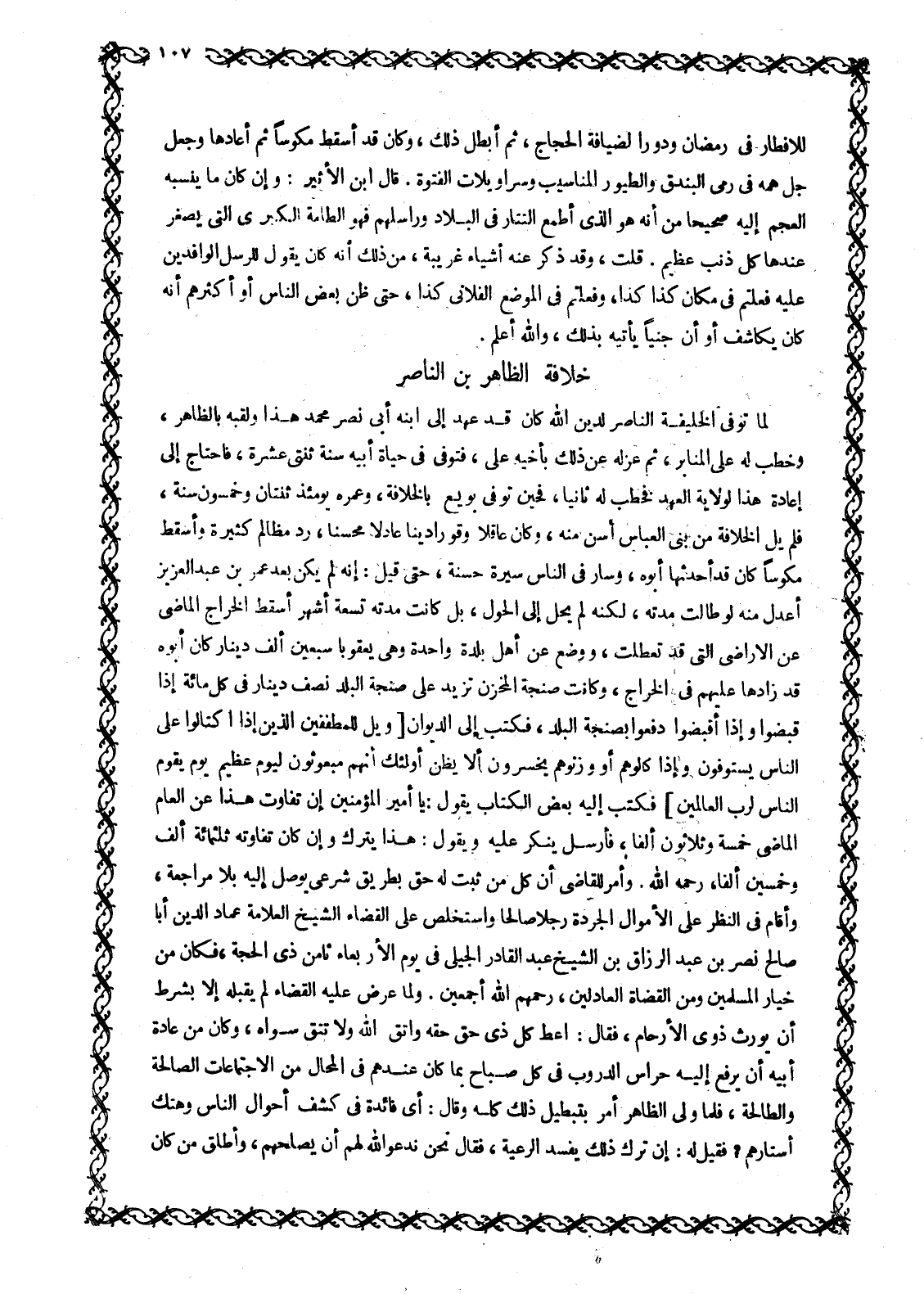 لِلْإِفْطَارِ فِي رَمَضَانَ وَدُورًا لِضِيَافَةِ الْحُجَّاجِ، ثُمَّ أَبْطَلَ ذَلِكَ، وَكَانَ قَدْ أَسْقَطَ مُكُوسًا ثُمَّ أَعَادَهَا وَجَعَلَ جُلَّ هَمِّهِ فِي رَمْيِ الْبُنْدُقِ وَالطُّيُورِ الْمَنَاسِيبِ وَسَرَاوِيلَاتِ الْفُتُوَّةِ. قَالَ ابْنُ الْأَثِيرِ: وَإِنْ كَانَ مَا يَنْسُبُهُ الْعَجَمُ إِلَيْهِ صَحِيحًا مِنْ أَنَّهُ هُوَ الَّذِي أَطْمَعَ التَّتَارَ فِي الْبِلَادِ وَرَاسَلَهُمْ فَهُوَ الطَّامَّةُ الْكُبْرَى الَّتِي يَصْغُرُ عِنْدَهَا كُلُّ ذَنْبٍ عَظِيمٍ. قُلْتُ، وَقَدْ ذُكِرَ عَنْهُ أَشْيَاءُ غَرِيبَةٌ، مِنْ ذَلِكَ أَنَّهُ كَانَ يَقُولُ لِلرُّسُلِ الْوَافِدِينَ عَلَيْهِ فَعَلْتُمْ فِي مَكَانِ كذا كذا، وفعلتم في الْمَوْضِعِ الْفُلَانِيِّ كَذَا، حَتَّى ظَنَّ بَعْضُ النَّاسِ أَوْ أَكْثَرُهُمْ أَنَّهُ كَانَ يُكَاشَفُ أَوْ أَنَّ جِنِّيًّا يَأْتِيهِ بِذَلِكَ، وَاللَّهُ أَعْلَمُ.