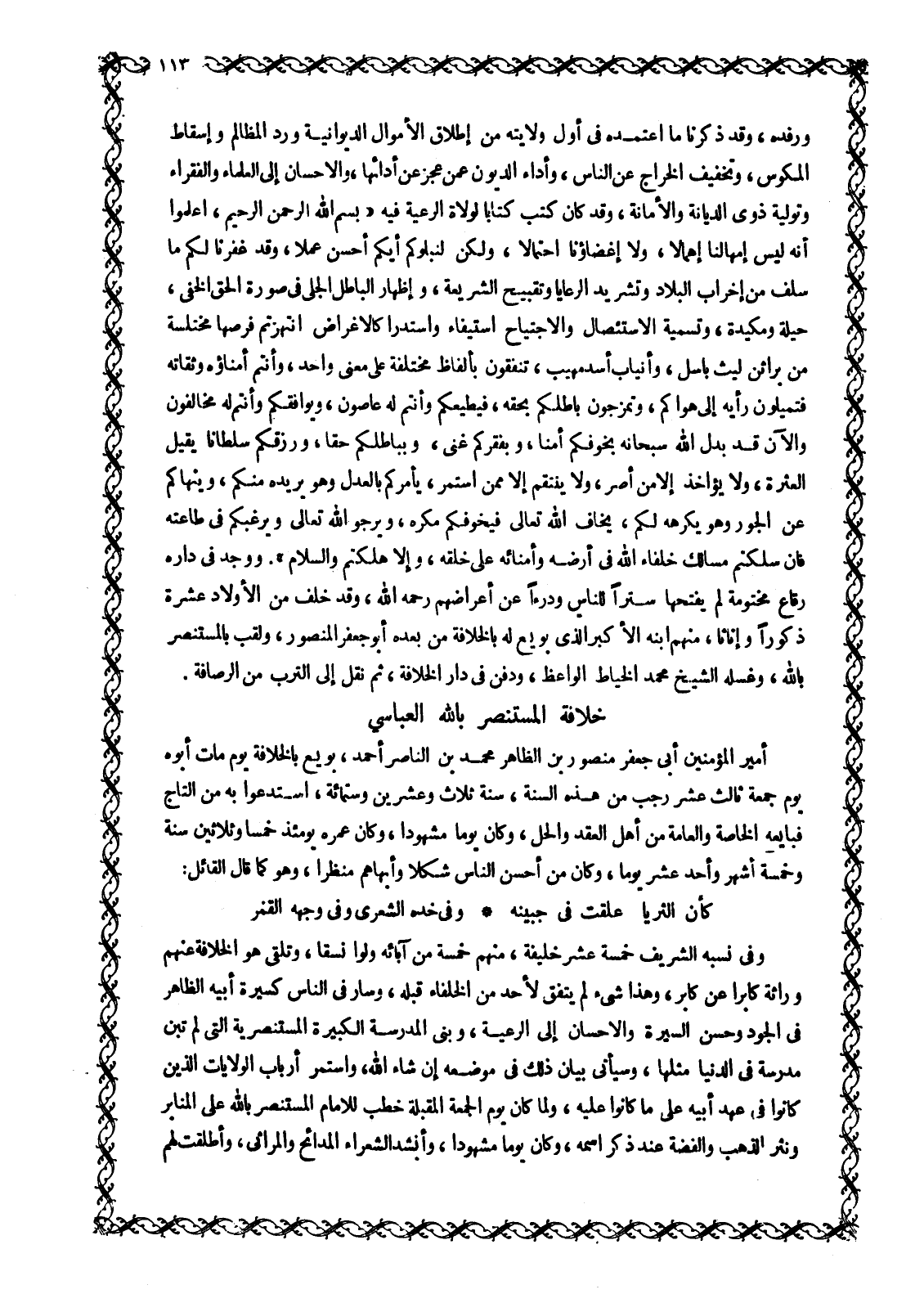 وَرِفْدَهُ، وَقَدْ ذَكَرْنَا مَا اعْتَمَدَهُ فِي أَوَّلِ وِلَايَتِهِ مِنْ إِطْلَاقِ الْأَمْوَالِ الدِّيوَانِيَّةِ وَرَدِّ الْمَظَالِمِ وَإِسْقَاطِ الْمُكُوسِ، وَتَخْفِيفِ الْخَرَاجِ عَنِ النَّاسِ، وَأَدَاءِ الديون عمن عجز عن أدائها، وَالْإِحْسَانِ إِلَى الْعُلَمَاءِ وَالْفُقَرَاءِ وَتَوْلِيَةِ ذَوِي الدِّيَانَةِ والأمانة، وَقَدْ كَانَ كَتَبَ كِتَابًا لِوُلَاةِ الرَّعِيَّةِ فِيهِ «بِسْمِ اللَّهِ الرَّحْمَنِ الرَّحِيمِ، اعْلَمُوا أَنَّهُ لَيْسَ إِمْهَالُنَا إِهْمَالًا، وَلَا إِغْضَاؤُنَا احْتِمَالًا، وَلَكِنْ لَنَبْلُوَكُمْ أَيُّكُمْ أَحْسَنُ عَمَلًا، وَقَدْ غَفَرْنَا لَكُمْ مَا سَلَفَ مِنْ إِخْرَابِ الْبِلَادِ وَتَشْرِيدِ الرَّعَايَا وَتَقْبِيحِ الشَّرِيعَةِ، وَإِظْهَارِ الْبَاطِلِ الْجَلِيِّ فِي صُورَةِ الْحَقِّ الْخَفِيِّ، حِيلَةً وَمَكِيدَةً، وَتَسْمِيَةِ الِاسْتِئْصَالِ وَالِاجْتِيَاحِ اسْتِيفَاءً وَاسْتِدْرَاكًا لِأَغْرَاضٍ انْتَهَزْتُمْ فُرَصَهَا مُخْتَلَسَةً مِنْ بَرَاثِنِ لَيْثٍ بَاسِلٍ، وَأَنْيَابِ أَسَدٍ مَهِيبٍ، تُنْفِقُونَ بِأَلْفَاظٍ مُخْتَلِفَةٍ عَلَى مَعْنًى وَاحِدٍ، وَأَنْتُمْ أُمَنَاؤُهُ وَثِقَاتُهُ فَتُمِيلُونَ رَأْيَهُ إِلَى هَوَاكُمْ، وَتَمْزُجُونَ بَاطِلَكُمْ بِحَقِّهِ، فَيُطِيعُكُمْ وَأَنْتُمْ لَهُ عَاصُونَ، وَيُوَافِقُكُمْ وَأَنْتُمْ لَهُ مخالفون والآن قد بدل الله سبحانه بِخَوْفِكُمْ أَمْنًا، وَبِفَقْرِكُمْ غِنًى، وَبِبَاطِلِكُمْ حَقًّا، وَرَزَقَكُمْ سلطانا يقيل العثرة، ولا يؤاخذ إلا من أَصَرَّ، وَلَا يَنْتَقِمُ إِلَّا مِمَّنِ اسْتَمَرَّ، يَأْمُرُكُمْ بِالْعَدْلِ وَهُوَ يُرِيدُهُ مِنْكُمْ، وَيَنْهَاكُمْ عَنِ الْجَوْرِ وَهُوَ يَكْرَهُهُ لَكُمْ، يَخَافُ اللَّهَ تَعَالَى فَيُخَوِّفُكُمْ مَكْرَهُ، وَيَرْجُو اللَّهَ تَعَالَى وَيُرَغِّبُكُمْ فِي طَاعَتِهِ فَإِنْ سَلَكْتُمْ مَسَالِكَ خُلَفَاءِ اللَّهِ فِي أَرْضِهِ وَأُمَنَائِهِ عَلَى خَلْقِهِ، وَإِلَّا هَلَكْتُمْ وَالسَّلَامُ» . وَوُجِدَ في داره رقاع مختومة لَمْ يَفْتَحْهَا سَتْرًا لِلنَّاسِ وَدَرْءًا عَنْ أَعْرَاضِهِمْ رَحِمَهُ اللَّهُ، وَقَدْ خَلَّفَ مِنَ الْأَوْلَادِ عَشْرَةً ذُكُورًا وَإِنَاثًا، مِنْهُمُ ابْنُهُ الْأَكْبَرُ الَّذِي بُويِعَ لَهُ بِالْخِلَافَةِ مِنْ بَعْدِهِ أَبُو جَعْفَرٍ الْمَنْصُورُ، ولقب بالمستنصر باللَّه، وغسله الشيخ مُحَمَّدٌ الْخَيَّاطُ الْوَاعِظُ، وَدُفِنَ فِي دَارِ الْخِلَافَةِ، ثُمَّ نُقِلَ إِلَى التُّرَبِ مِنَ الرُّصَافَةِ.