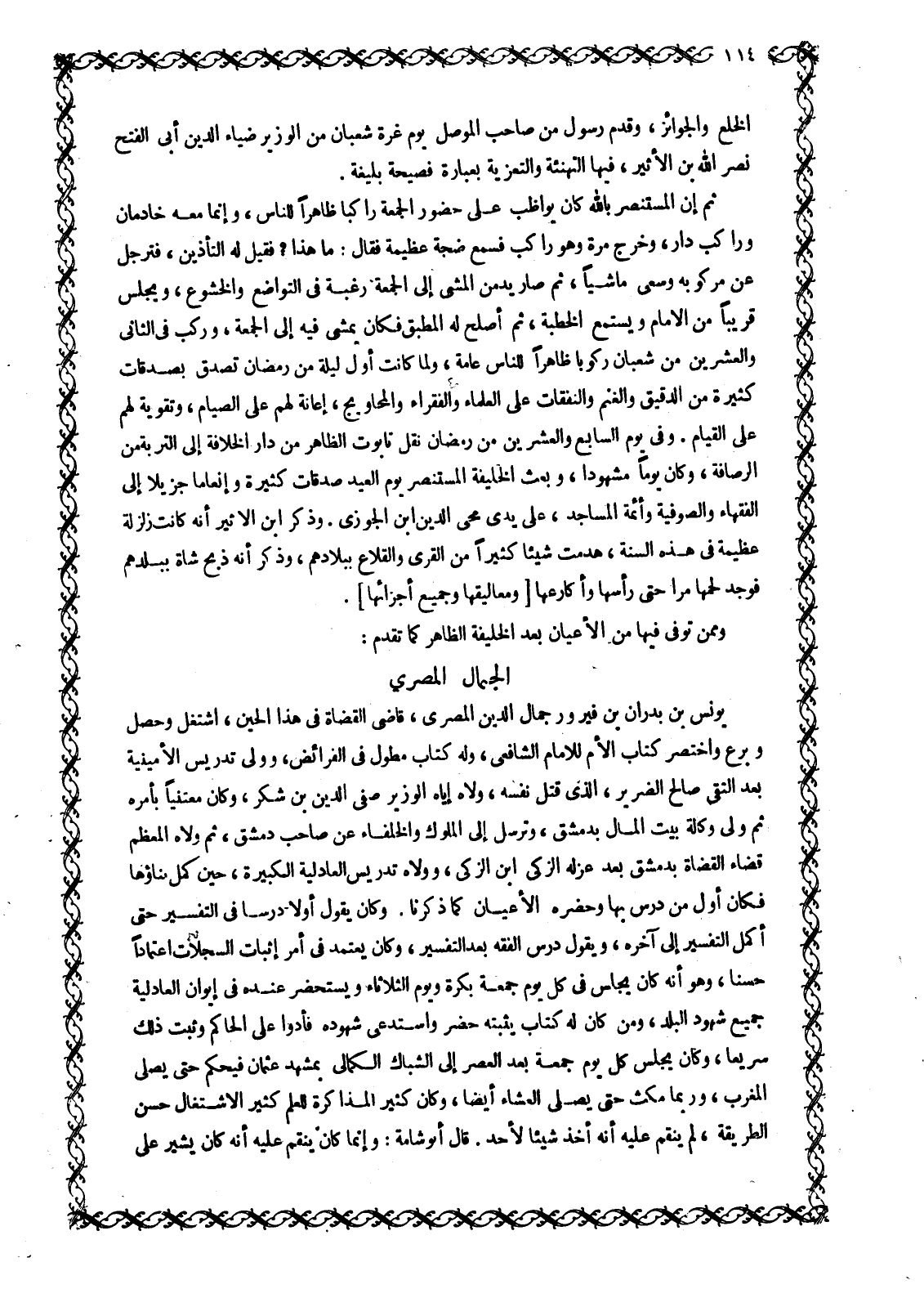 الْخِلَعُ وَالْجَوَائِزُ، وَقَدِمَ رَسُولٌ مِنْ صَاحِبِ الْمَوْصِلِ يوم غرة شعبان من الْوَزِيرِ ضِيَاءِ الدِّينِ أَبِي الْفَتْحِ نَصْرِ اللَّهِ بْنِ الْأَثِيرِ، فِيهَا التَّهْنِئَةُ وَالتَّعْزِيَةُ بِعِبَارَةٍ فَصِيحَةٍ بَلِيغَةٍ.