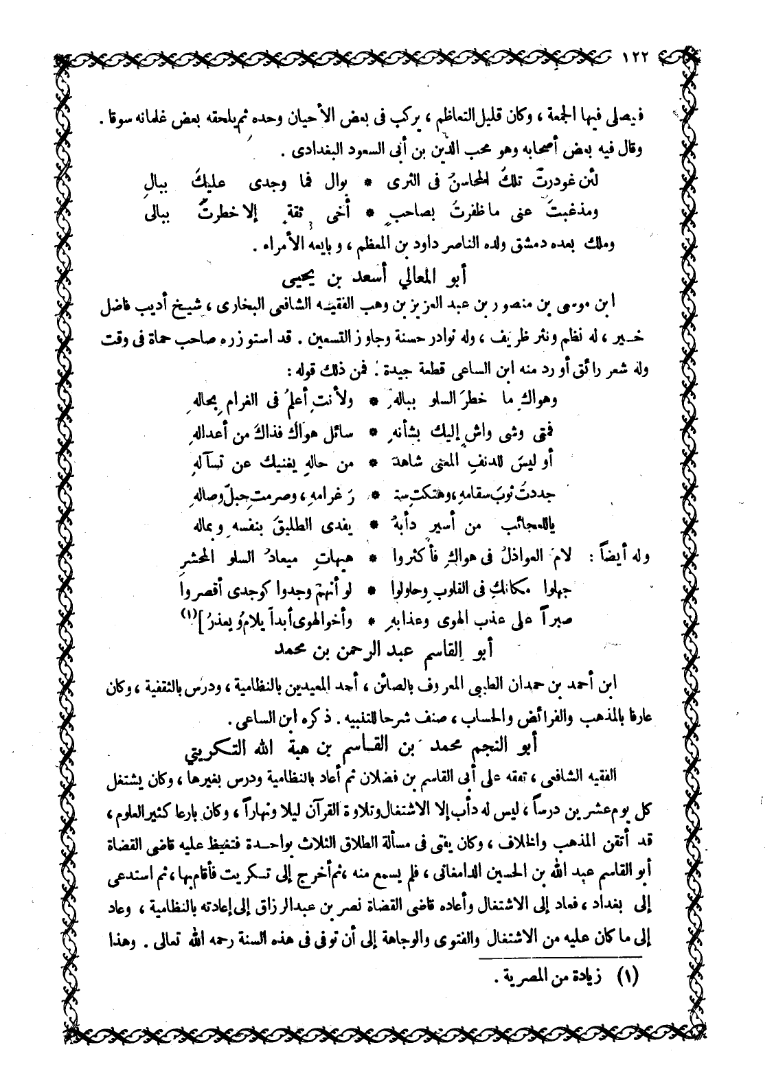 الْفَقِيهُ الشافعيّ، تفقه عَلَى أَبِي الْقَاسِمِ بْنِ فَضْلَانَ ثُمَّ أَعَادَ بالنظاميّة ودرس بغيرها، وكان يشتغل كل يوم عشرين درسا، ليس لَهُ دَأْبٌ إِلَّا الِاشْتِغَالُ وَتِلَاوَةُ الْقُرْآنِ لَيْلًا وَنَهَارًا، وَكَانَ بَارِعًا كَثِيرَ الْعُلُومِ، قَدْ أَتْقَنَ الْمَذْهَبَ وَالْخِلَافَ، وَكَانَ يُفْتِي فِي مَسْأَلَةِ الطَّلَاقِ الثَّلَاثِ بِوَاحِدَةٍ فَتَغَيَّظَ عَلَيْهِ قَاضِي الْقُضَاةِ أَبُو الْقَاسِمِ عَبْدُ اللَّهِ بْنُ الْحُسَيْنِ الدَّامَغَانِيُّ، فَلَمْ يَسْمَعْ مِنْهُ، ثُمَّ أُخْرِجَ إِلَى تَكْرِيتَ فَأَقَامَ بِهَا، ثُمَّ اسْتُدْعِيَ إِلَى بَغْدَادَ، فَعَادَ إِلَى الِاشْتِغَالِ وَأَعَادَهُ قَاضِي الْقُضَاةِ نَصْرُ بْنُ عَبْدِ الرَّزَّاقِ إِلَى إِعَادَتِهِ بِالنِّظَامِيَّةِ، وَعَادَ إِلَى مَا كَانَ عَلَيْهِ مِنَ الِاشْتِغَالِ وَالْفَتْوَى وَالْوَجَاهَةِ إِلَى أَنْ تُوُفِّيَ فِي هَذِهِ السَّنَةِ رَحِمَهُ اللَّهُ تَعَالَى. وهذا