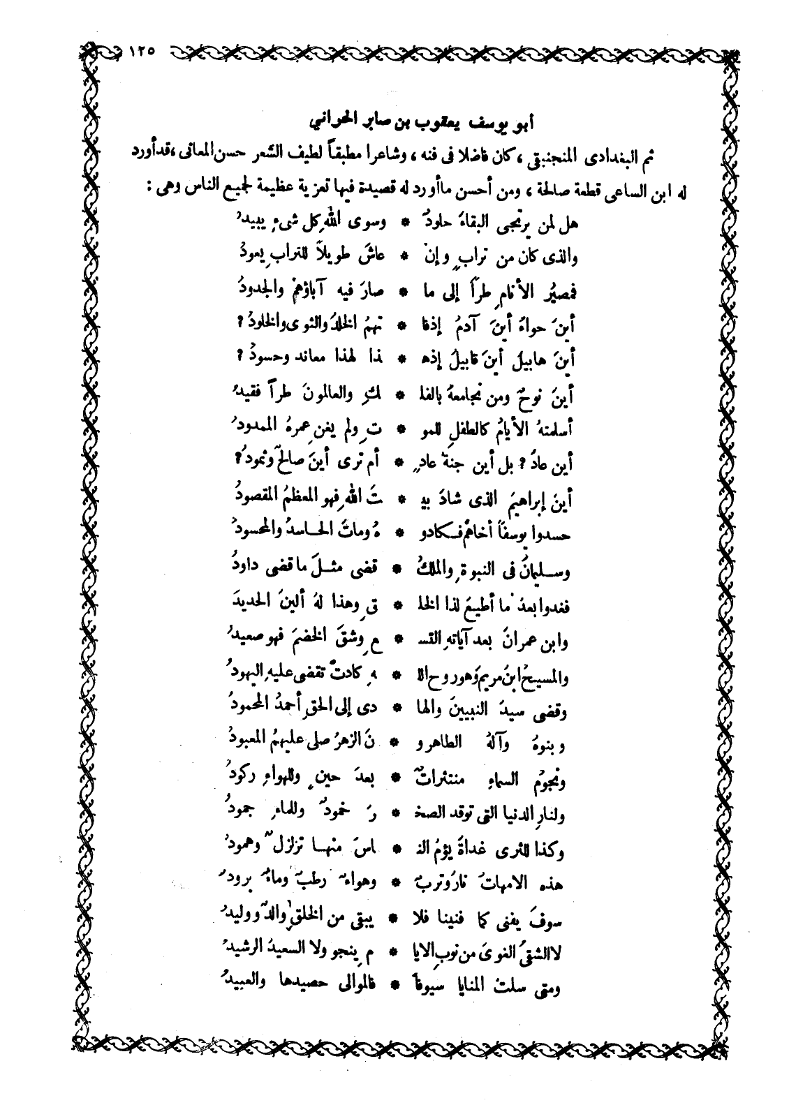 ثُمَّ الْبَغْدَادِيُّ الْمَنْجَنِيقِيُّ، كَانَ فَاضِلًا فِي فَنِّهِ، وَشَاعِرًا مُطَبِّقًا لَطِيفَ الشِّعْرِ حَسَنَ الْمَعَانِي، قَدْ أَوْرَدَ لَهُ ابْنُ السَّاعِي قِطْعَةً صَالِحَةً، وَمِنْ أَحْسَنِ مَا أَوْرَدَ لَهُ قَصِيدَةٌ فِيهَا تَعْزِيَةٌ عَظِيمَةٌ لجميع الناس وهي: