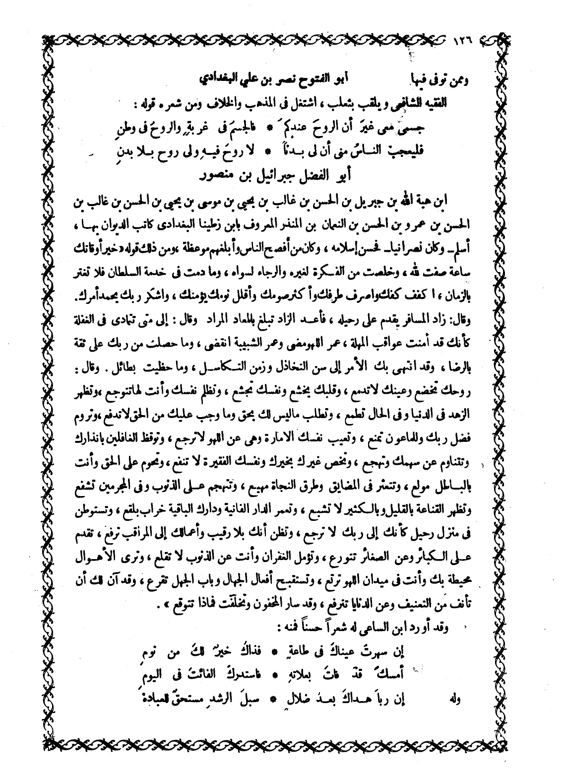 ابن هِبَةِ اللَّهِ بْنِ جِبْرِيلَ بْنِ الْحَسَنِ بْنِ غَالِبِ بْنِ يَحْيَى بْنِ مُوسَى بْنِ يَحْيَى بْنِ الْحَسَنِ بْنِ غَالِبِ بْنِ الْحَسَنِ بْنِ عَمْرِو بْنِ الْحَسَنِ بْنِ النُّعْمَانِ بْنِ الْمُنْذِرِ الْمَعْرُوفُ بِابْنِ زُطِينَا الْبَغْدَادِيُّ كَاتِبُ الدِّيوَانِ بِهَا، أَسْلَمَ- وَكَانَ نَصْرَانِيًّا- فَحَسُنَ إِسْلَامُهُ، وَكَانَ مِنْ أفصح الناس وأبلغهم موعظة، ومن ذَلِكَ قَوْلُهُ «خَيْرُ أَوْقَاتِكَ سَاعَةٌ صَفَتْ للَّه، وَخَلَصَتْ مِنَ الْفِكْرَةِ لِغَيْرِهِ وَالرَّجَاءِ لِسِوَاهُ، وَمَا دُمْتَ فِي خِدْمَةِ السُّلْطَانِ فَلَا تَغْتَرَّ بِالزَّمَانِ، اكْفُفْ كَفَّكَ وَاصْرِفْ طَرْفَكَ وَأَكْثِرْ صَوْمَكَ وَأَقْلِلْ نومك يؤمنك، وَاشْكُرْ رَبَّكَ يُحْمَدْ أَمْرُكَ.