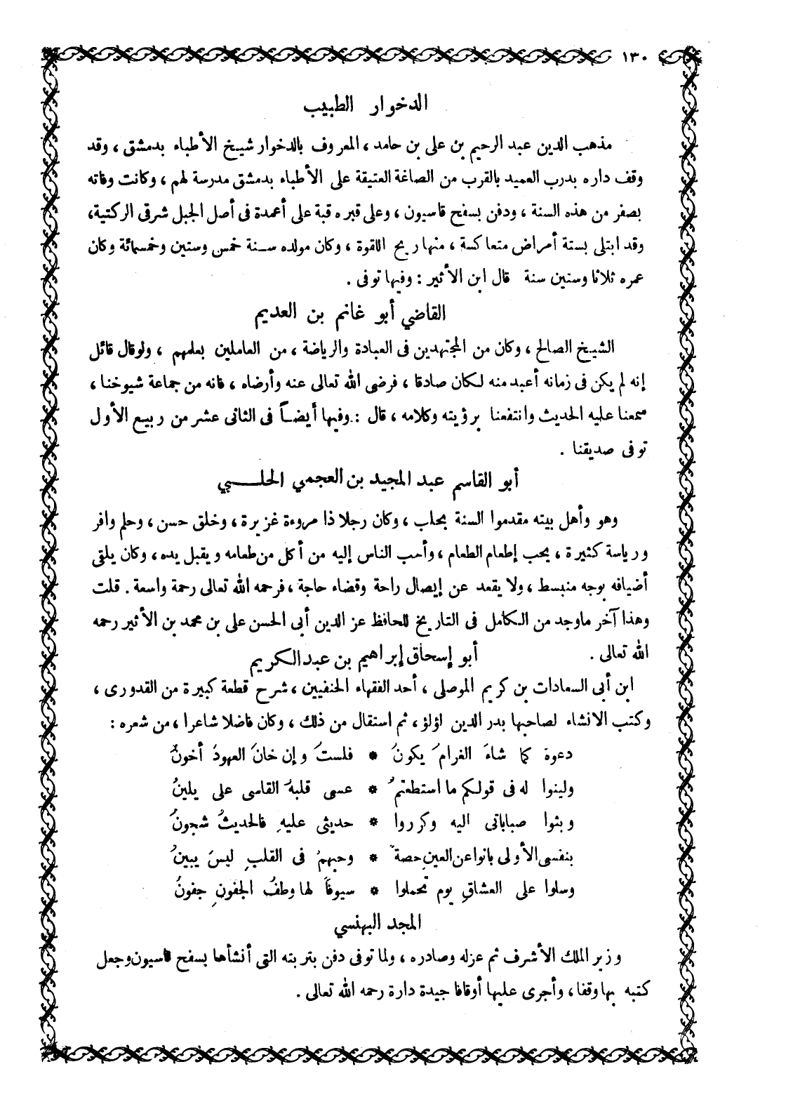 ابن أبى السعادات بن كريم الْمَوْصِلِيُّ، أَحَدُ الْفُقَهَاءِ الْحَنَفِيِّينَ، شَرَحَ قِطْعَةً كَبِيرَةً مِنَ الْقُدُورِيِّ، وَكَتَبَ الْإِنْشَاءَ لِصَاحِبِهَا بَدْرِ الدِّينِ لُؤْلُؤٍ، ثُمَّ اسْتَقَالَ مِنْ ذَلِكَ، وَكَانَ فَاضِلًا شاعرا، من شِعْرِهِ: