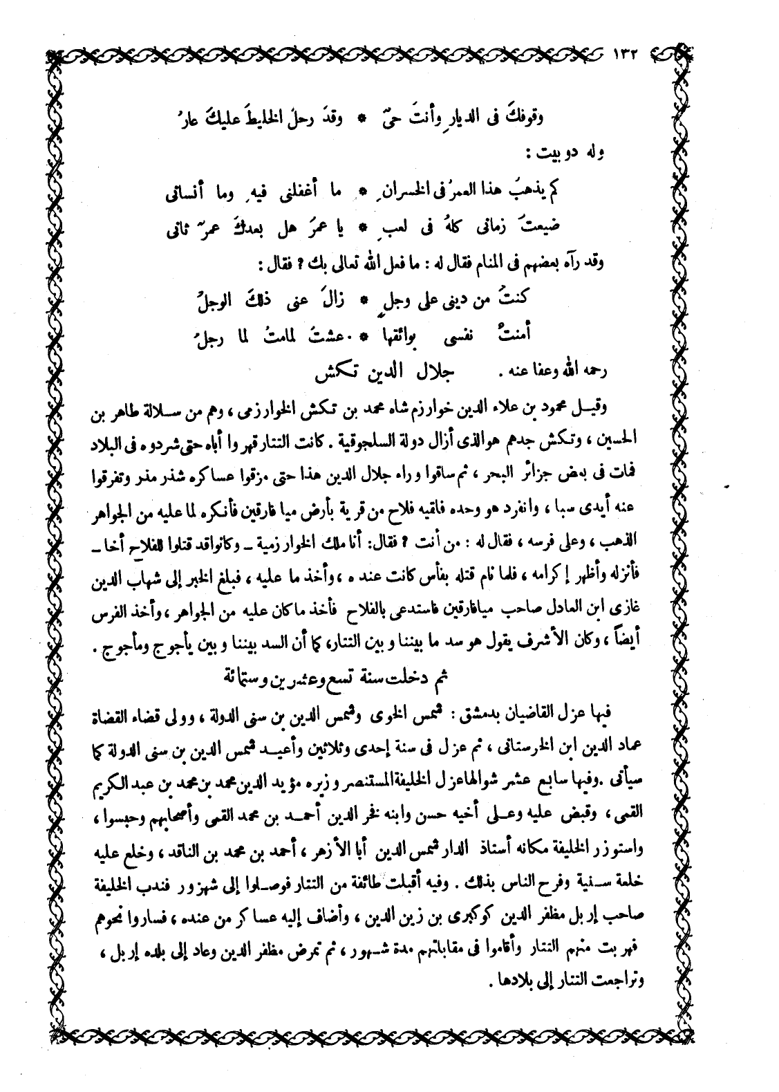 وَقِيلَ مَحْمُودُ بْنُ عَلَاءِ الدِّينِ خُوَارَزْمِ شَاهْ مُحَمَّدِ بْنِ تِكِشٍ الْخُوَارَزْمِيُّ، وَهُمْ مِنْ سُلَالَةِ طَاهِرِ بْنِ الْحُسَيْنِ، وَتِكِشٌ جَدُّهُمْ هُوَ الَّذِي أَزَالَ دَوْلَةَ السَلْجُوقِيَّةِ. كَانَتِ التَّتَارُ قَهَرُوا أباه حتى شردوه في البلاد فمات في بعض جَزَائِرِ الْبَحْرِ، ثُمَّ سَاقُوا وَرَاءَ جَلَالِ الدِّينِ هَذَا حَتَّى مَزَّقُوا عَسَاكِرَهُ شَذَرَ مَذَرَ وَتَفَرَّقُوا عَنْهُ أَيْدِي سَبَا، وَانْفَرَدَ هُوَ وَحْدَهُ فَلَقِيَهُ فَلَّاحٌ مِنْ قَرْيَةٍ بِأَرْضِ مَيَّافَارِقِينَ فَأَنْكَرَهُ لِمَا عليه من الجواهر الذهب، وَعَلَى فَرَسِهِ، فَقَالَ لَهُ: مَنْ أَنْتَ؟ فَقَالَ: أَنَا مَلِكُ الْخُوَارَزْمِيَّةِ- وَكَانُوا قَدْ قَتَلُوا لِلْفَلَّاحِ أَخًا- فَأَنْزَلَهُ وَأَظْهَرَ إِكْرَامَهُ، فَلَمَّا نَامَ قَتَلَهُ بِفَأْسٍ كَانَتْ عِنْدَهُ، وَأَخَذَ مَا عَلَيْهِ، فَبَلَغَ الخبر إلى شهاب الدين غازى ابن الْعَادِلِ صَاحِبِ مَيَّافَارِقِينَ فَاسْتَدْعَى بِالْفَلَّاحِ فَأَخَذَ مَا كان عليه من الجواهر، وأخذ الفرس أيضا، وكان الأشرف يقول هو سد ما بَيْنَنَا وَبَيْنَ التَّتَارِ، كَمَا أَنَّ السَّدَّ بَيْنَنَا وَبَيْنَ يَأْجُوجَ وَمَأْجُوجَ.