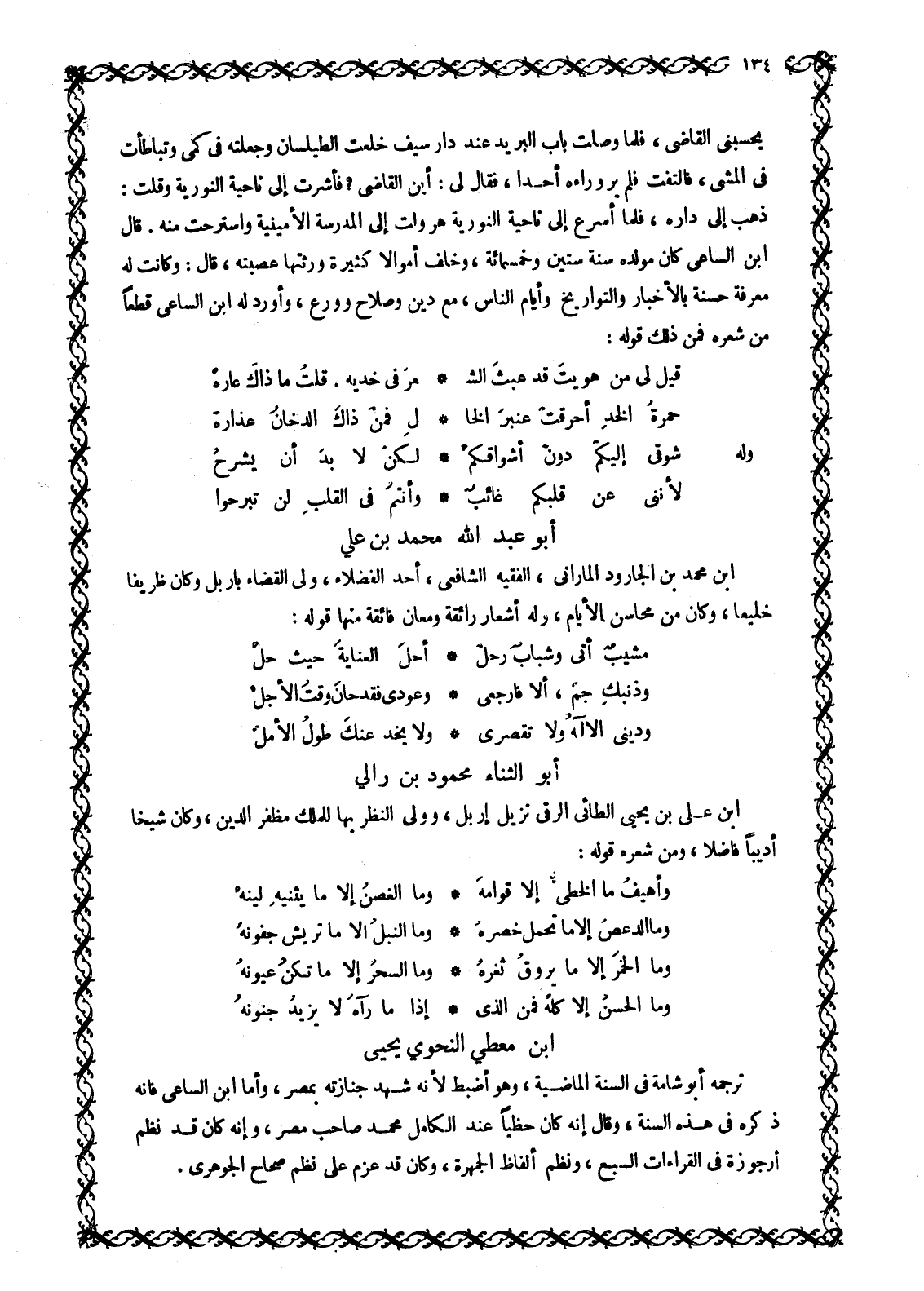 ابن عَلِيِّ بْنِ يَحْيَى الطَّائِيُّ الرُّقِّيُّ نَزِيلُ إِرْبِلَ، وَوَلِيَ النَّظَرَ بِهَا لِلْمَلِكِ مُظَفَّرِ الدِّينِ، وَكَانَ شَيْخًا أَدِيبًا فَاضِلًا، وَمِنْ شِعْرِهِ قَوْلُهُ: