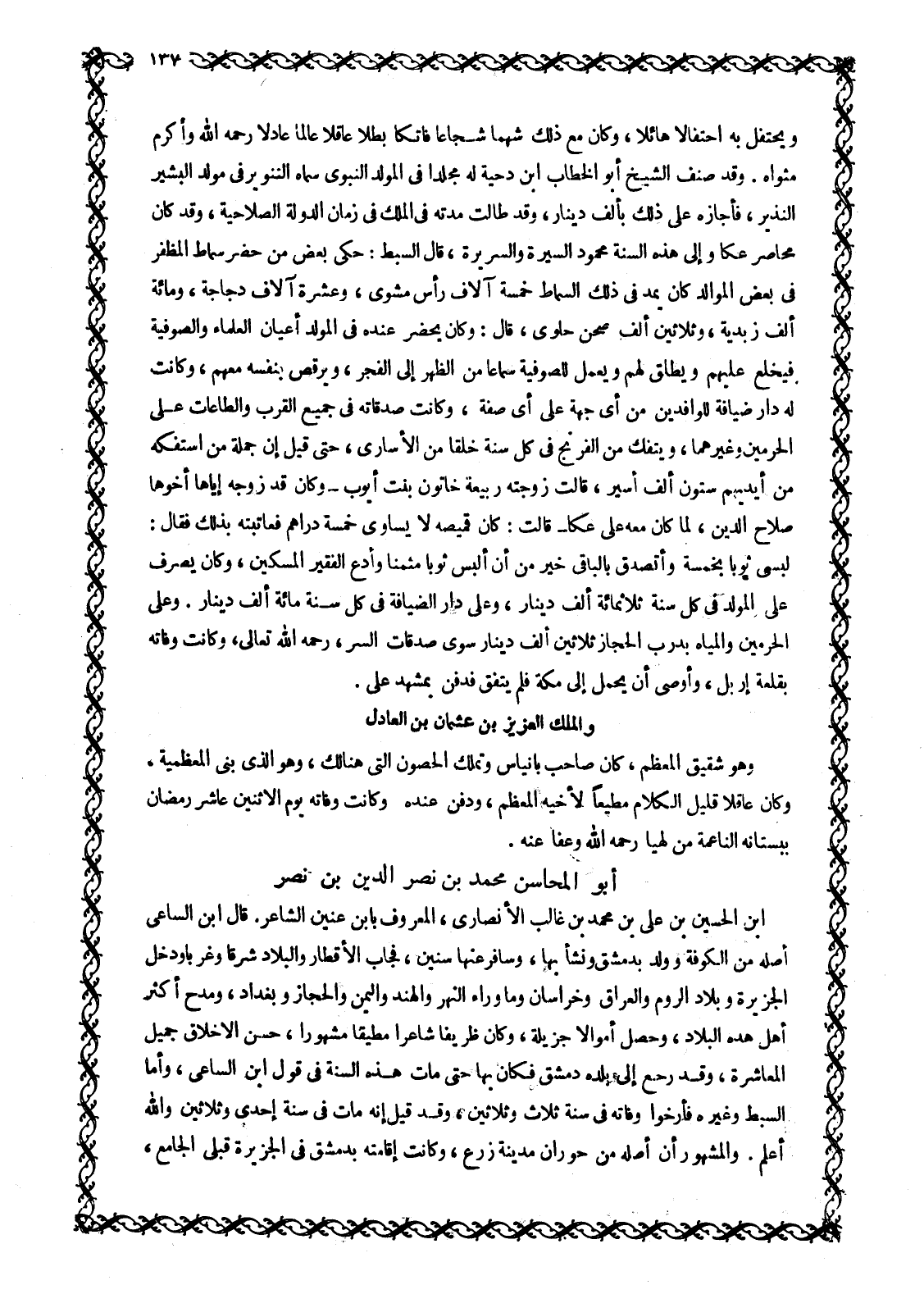 وَيَحْتَفِلُ بِهِ احْتِفَالًا هَائِلًا، وَكَانَ مَعَ ذَلِكَ شهما شجاعا فاتكا بطلا عاقلا عالما عادلا رحمه الله وأكرم مثواه. وقد صنف الشيخ أبو الخطاب ابن دِحْيَةَ لَهُ مُجَلَّدًا فِي الْمَوْلِدِ النَّبَوِيِّ سَمَّاهُ التنوير في مولد البشير النذير، فَأَجَازَهُ عَلَى ذَلِكَ بِأَلْفِ دِينَارٍ، وَقَدْ طَالَتْ مُدَّتُهُ فِي الْمُلْكِ فِي زَمَانِ الدَّوْلَةِ الصَّلَاحِيَّةِ، وقد كان محاصر عَكَّا وَإِلَى هَذِهِ السَّنَةِ مَحْمُودَ السِّيرَةِ وَالسَّرِيرَةِ، قَالَ السِّبْطُ: حَكَى بَعْضُ مَنْ حَضَرَ سِمَاطَ المظفر في بعض الموالد كان يمد في ذلك السماط خمسة آلاف رأس مشوى، وَعَشَرَةَ آلَافِ دَجَاجَةٍ، وَمِائَةَ أَلْفِ زُبْدِيَّةٍ، وَثَلَاثِينَ أَلْفَ صَحْنِ حَلْوَى، قَالَ: وَكَانَ يَحْضُرُ عِنْدَهُ فِي الْمَوْلِدِ أَعْيَانُ الْعُلَمَاءِ وَالصُّوفِيَّةِ فَيَخْلَعُ عَلَيْهِمْ وَيُطْلِقُ لَهُمْ وَيَعْمَلُ لِلصُّوفِيَّةِ سَمَاعًا مِنَ الظُّهْرِ إِلَى الْفَجْرِ، وَيَرْقُصُ بِنَفْسِهِ مَعَهُمْ، وَكَانَتْ لَهُ دَارُ ضِيَافَةٍ لِلْوَافِدِينَ مِنْ أَيِّ جِهَةٍ عَلَى أَيِّ صِفَةٍ، وَكَانَتْ صَدَقَاتُهُ فِي جَمِيعِ الْقُرَبِ والطاعات على الحرمين وغيرهما، ويتفك مِنَ الْفِرِنْجِ فِي كُلِّ سَنَةٍ خَلْقًا مِنَ الأسارى، حتى قيل إن جملة من استفكه مِنْ أَيْدِيهِمْ سِتُّونَ أَلْفَ أَسِيرٍ، قَالَتْ زَوْجَتُهُ ربيعة خاتون بنت أيوب- وكان قد زَوَّجَهُ إِيَّاهَا أَخُوهَا صَلَاحُ الدِّينِ، لَمَّا كَانَ مَعَهُ عَلَى عَكَّا- قَالَتْ: كَانَ قَمِيصُهُ لَا يساوى خمسة دراهم فَعَاتَبْتُهُ بِذَلِكَ فَقَالَ: