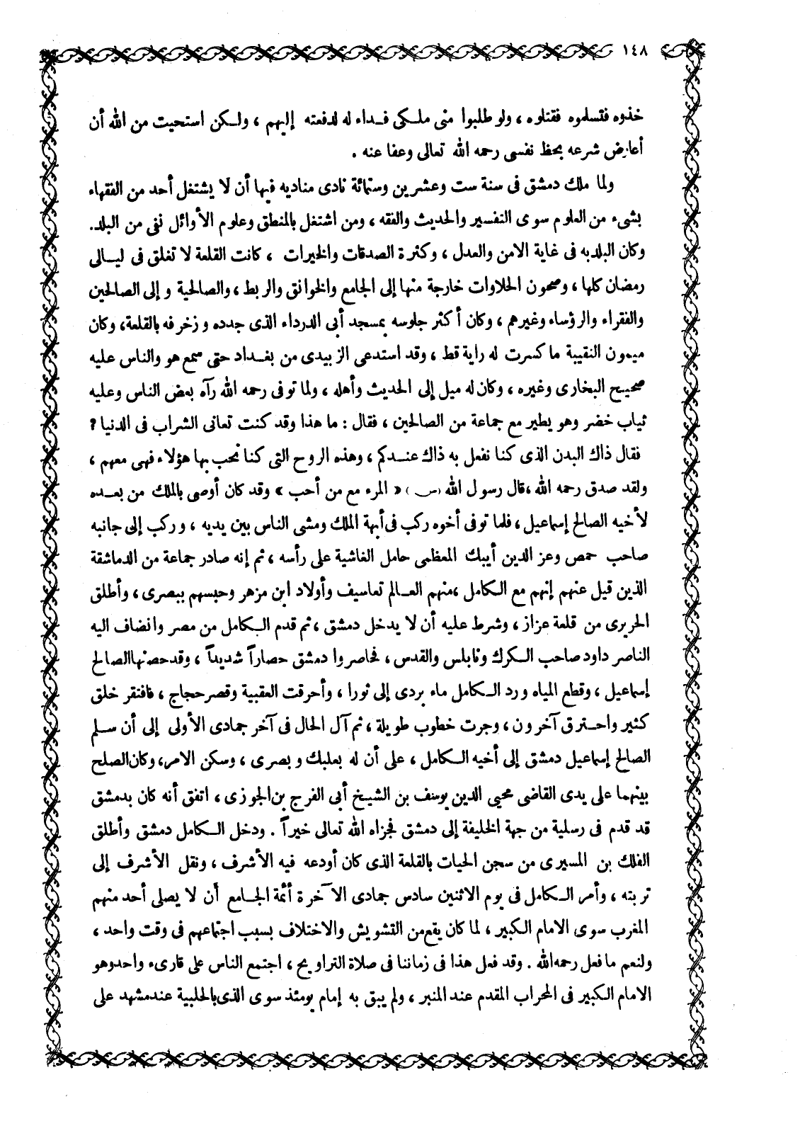 فَقَالَ ذَاكَ الْبَدَنُ الَّذِي كُنَّا نَفْعَلُ به ذاك عندكم، وَهَذِهِ الرُّوحُ الَّتِي كُنَّا نُحِبُّ بِهَا هَؤُلَاءِ فَهِيَ مَعَهُمْ، وَلَقَدْ صَدَقَ رَحِمَهُ اللَّهِ، قَالَ رَسُولُ اللَّهِ صَلَّى اللَّهُ عَلَيْهِ وَسَلَّمَ «الْمَرْءُ مَعَ مَنْ أَحَبَّ» وَقَدْ كَانَ أَوْصَى بِالْمُلْكِ مِنْ بَعْدِهِ لِأَخِيهِ الصَّالِحِ إِسْمَاعِيلَ، فَلَمَّا تُوُفِّيَ أَخُوهُ رَكِبَ فِي أُبَّهَةِ الْمُلْكِ وَمَشَى النَّاسُ بَيْنَ يَدَيْهِ، وَرَكِبَ إِلَى جَانِبِهِ صَاحِبُ حِمْصَ وَعِزُّ الدِّينِ أَيْبَكُ الْمُعَظَّمِيُّ حَامِلٌ الْغَاشِيَةَ عَلَى رَأْسِهِ، ثُمَّ إِنَّهُ صَادَرَ جَمَاعَةً مِنَ الدَّمَاشِقَةِ الَّذِينَ قِيلَ عَنْهُمْ إِنَّهُمْ مَعَ الْكَامِلِ، مِنْهُمُ العالم تَعَاسِيفُ وَأَوْلَادُ ابْنِ مُزْهِرٍ وَحَبَسَهُمْ بِبُصْرَى، وَأَطْلَقَ الحريري من قلعة عزاز، وَشَرَطَ عَلَيْهِ أَنْ لَا يَدْخُلَ دِمَشْقَ، ثُمَّ قَدِمَ الْكَامِلُ مِنْ مِصْرَ وَانْضَافَ إِلَيْهِ النَّاصِرُ دَاوُدُ صَاحِبُ الْكَرَكِ وَنَابُلُسَ وَالْقُدْسِ، فَحَاصَرُوا دِمَشْقَ حصارا شديدا، وقد حصنها الصالح إسماعيل، وقطع الْمِيَاهُ وَرَدَّ الْكَامِلُ مَاءَ بَرَدَى إِلَى ثَوْرَا، وأحرقت العقبية وَقَصْرُ حَجَّاجٍ، فَافْتَقَرَ خَلْقٌ كَثِيرٌ وَاحْتَرَقَ آخَرُونَ، وجرت خطوب طويلة، ثُمَّ آلَ الْحَالُ فِي آخِرِ جُمَادَى الْأُولَى إِلَى أَنْ سَلَّمَ الصَّالِحُ إِسْمَاعِيلُ دِمَشْقَ إِلَى أَخِيهِ الْكَامِلِ، عَلَى أَنَّ لَهُ بَعْلَبَكَّ وَبُصْرَى، وَسَكَنَ الْأَمْرُ، وَكَانَ الصُّلْحُ بَيْنَهُمَا عَلَى يَدَيِ الْقَاضِي مُحْيِي الدِّينِ يُوسُفَ بْنِ الشَّيْخِ أَبِي الْفَرَجِ بْنِ الْجَوْزِيِّ، اتَّفَقَ أَنَّهُ كَانَ بِدِمَشْقَ قَدْ قَدِمَ فِي رَسْلِيَّةٍ مِنْ جِهَةِ الْخَلِيفَةِ إِلَى دِمَشْقَ فَجَزَاهُ اللَّهُ تَعَالَى خَيْرًا. وَدَخَلَ الْكَامِلُ دِمَشْقَ وَأَطْلَقَ الْفَلَكَ بْنَ الْمَسِيرِيِّ مِنْ سِجْنِ الْحَيَّاتِ بِالْقَلْعَةِ الَّذِي كَانَ أَوْدَعَهُ فِيهِ الْأَشْرَفُ، وَنُقِلَ الْأَشْرَفُ إِلَى تُرْبَتِهِ، وَأَمَرَ الْكَامِلُ فِي يَوْمِ الِاثْنَيْنِ سَادِسِ جُمَادَى الْآخِرَةِ أَئِمَّةَ الْجَامِعِ أَنْ لَا يُصَلِّيَ أَحَدٌ مِنْهُمُ الْمَغْرِبَ سِوَى الْإِمَامِ الْكَبِيرِ، لِمَا كَانَ يَقَعُ مِنَ التَّشْوِيشِ وَالِاخْتِلَافِ بِسَبَبِ اجْتِمَاعِهِمْ فِي وَقْتٍ وَاحِدٍ، ولنعم ما فعل رحمه الله. وَقَدْ فُعِلَ هَذَا فِي زَمَانِنَا فِي صَلَاةِ التَّرَاوِيحِ، اجْتَمَعَ النَّاسُ عَلَى قَارِئٍ وَاحِدٍ وَهُوَ الْإِمَامُ الْكَبِيرُ فِي الْمِحْرَابِ الْمُقَدَّمِ عِنْدَ الْمِنْبَرِ، ولم يبق به إمام يومئذ سِوَى الَّذِي بِالْحَلَبَيَّةِ عِنْدَ مَشْهَدِ عَلَيٍّ