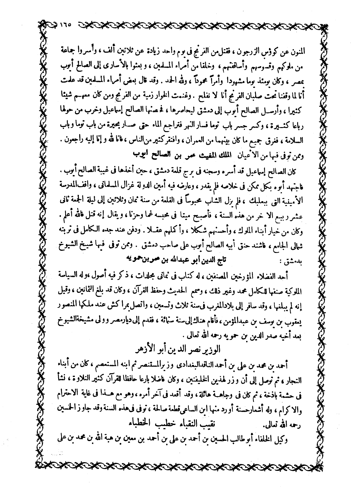 المنون عن كئوس الزرجون، فَقُتِلَ مِنَ الْفِرِنْجِ فِي يَوْمٍ وَاحِدٍ زِيَادَةٌ عن ثلاثين ألف، وَأَسَرُوا جَمَاعَةً مِنْ مُلُوكِهِمْ وَقُسُوسِهِمْ وَأَسَاقِفَتِهِمْ، وَخَلْقًا مِنْ أُمَرَاءِ الْمُسْلِمِينَ، وَبَعَثُوا بِالْأُسَارَى إِلَى الصَّالِحِ أَيُّوبَ بِمِصْرَ، وَكَانَ يَوْمَئِذٍ يَوْمًا مَشْهُودًا وَأَمْرًا محمودا، وللَّه الحمد. وَقَدْ قَالَ بَعْضُ أُمَرَاءِ الْمُسْلِمِينَ قَدْ عَلِمْتُ أَنَّا لَمَّا وَقَفْنَا تَحْتَ صُلْبَانِ الْفِرِنْجِ أَنَّا لا نفلح. وغنمت الخوارزمية من الفرنج ومن كَانَ مَعَهُمْ شَيْئًا كَثِيرًا، وَأَرْسَلَ الصَّالِحُ أَيُّوبُ إِلَى دِمَشْقَ لِيُحَاصِرَهَا، فَحَصَّنَهَا الصَّالِحُ إِسْمَاعِيلُ وَخَرَّبَ مِنْ حَوْلِهَا رِبَاعًا كَثِيرَةً، وَكَسَرَ جِسْرَ بَابِ توما فسار النَّهْرَ فَتَرَاجَعَ الْمَاءُ حَتَّى صَارَ بُحَيْرَةً مِنْ بَابِ تُومَا وَبَابِ السَلَامَةِ، فَغَرِقَ جَمِيعُ مَا كَانَ بَيْنَهُمَا مِنَ الْعُمْرَانِ، وَافْتَقَرَ كَثِيرٌ مِنَ الناس، ف إِنَّا لِلَّهِ وَإِنَّا إِلَيْهِ راجِعُونَ. 2: 156