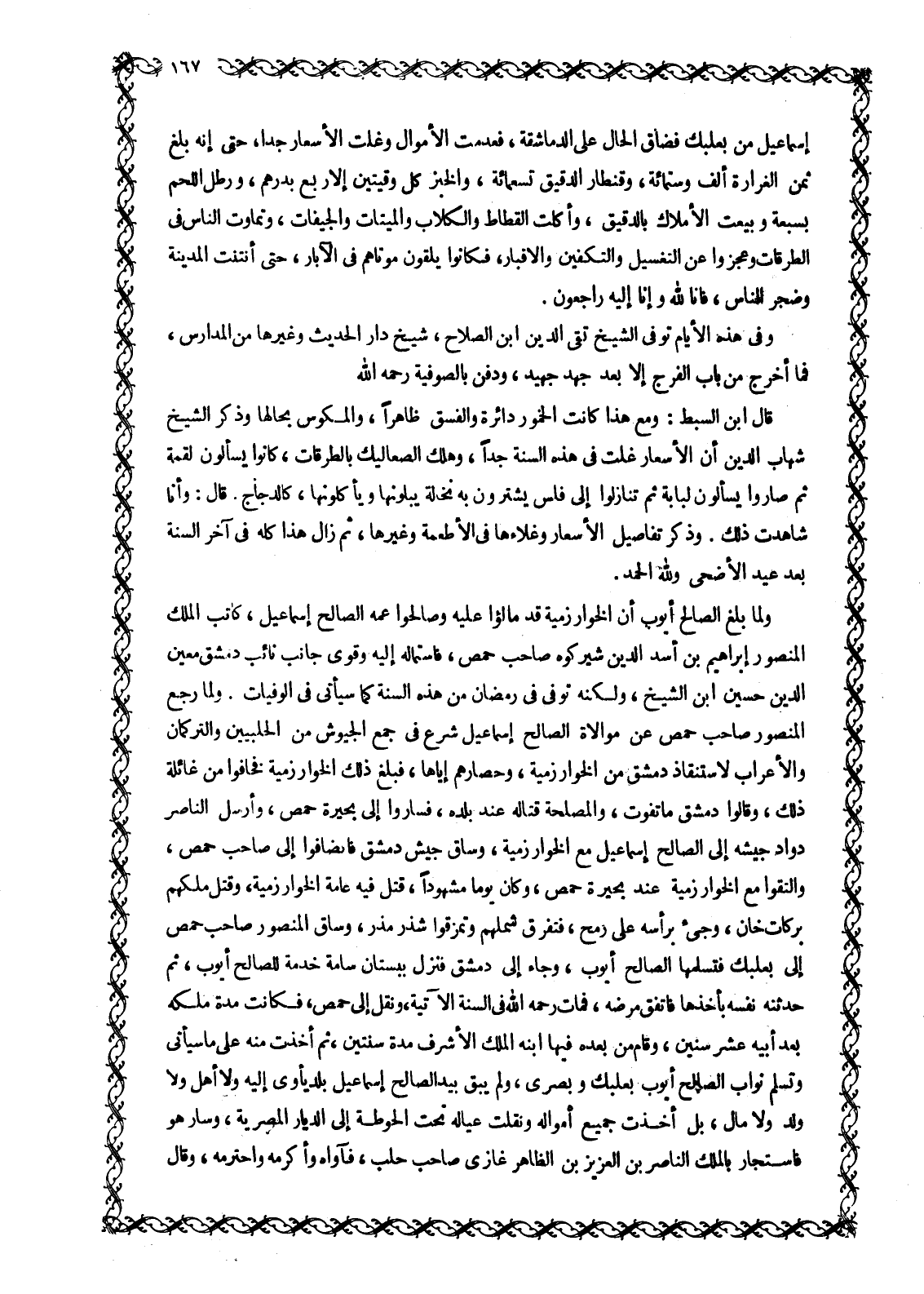 إِسْمَاعِيلُ مِنْ بَعْلَبَكَّ فَضَاقَ الْحَالُ عَلَى الدَّمَاشِقَةِ، فعدمت الأموال وَغَلَتِ الْأَسْعَارُ جِدًّا، حَتَّى إِنَّهُ بَلَغَ ثَمَنُ الغرارة ألف وستمائة، وقنطار الدقيق تسعمائة، والخبز كل وقيتين إلا ربع بدرهم، ورطل اللحم بسبعة وبيعت الأملاك بالدقيق، وأكلت القطاط والكلاب والميتات والجيفات، وَتَمَاوَتَ النَّاسُ فِي الطُّرُقَاتِ وَعَجَزُوا عَنِ التَّغْسِيلِ وَالتَّكْفِينِ وَالْإِقْبَارِ، فَكَانُوا يُلْقُونَ مَوْتَاهُمْ فِي الْآبَارِ، حتى أنتنت المدينة وضجر الناس، ف إِنَّا لِلَّهِ وَإِنَّا إِلَيْهِ راجِعُونَ. 2: 156 وَفِي هَذِهِ الْأَيَّامِ توفى الشيخ تقى الدين ابن الصَّلَاحِ، شَيْخُ دَارِ الْحَدِيثِ وَغَيْرِهَا مِنَ الْمَدَارِسِ، فما أخرج من باب الفرج إلا بعد جهد جهيد، ودفن بالصوفية رحمه الله قَالَ ابْنُ السِّبْطِ: وَمَعَ هَذَا كَانَتِ الْخُمُورُ دَائِرَةً وَالْفِسْقُ ظَاهِرًا، وَالْمُكُوسُ بِحَالِهَا وَذَكَرَ الشَّيْخُ شِهَابُ الدِّينِ أَنَّ الْأَسْعَارَ غَلَتْ فِي هَذِهِ السَّنَةِ جِدًّا، وَهَلَكَ الصَّعَالِيكُ بِالطُّرُقَاتِ، كَانُوا يَسْأَلُونَ لُقْمَةً ثُمَّ صَارُوا يَسْأَلُونَ لُبَابَةً ثُمَّ تَنَازَلُوا إلى فلس يشترون به نخلة يَبُلُّونَهَا وَيَأْكُلُونَهَا، كَالدَّجَاجِ. قَالَ: وَأَنَا شَاهَدْتُ ذَلِكَ. وَذَكَرَ تَفَاصِيلَ الْأَسْعَارِ وَغَلَاءَهَا فِي الْأَطْعِمَةِ وَغَيْرِهَا، ثُمَّ زَالَ هَذَا كُلُّهُ فِي آخِرِ السَّنَةِ بعد عيد الأضحى وللَّه الحمد.