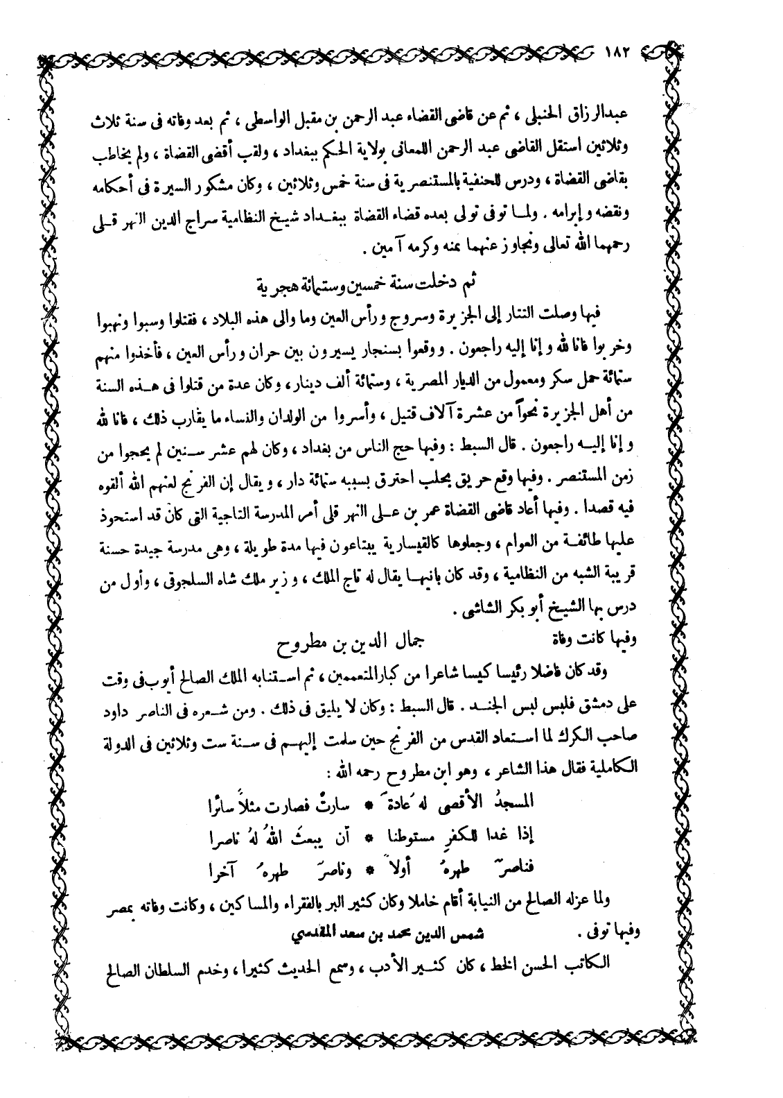 فِيهَا وَصَلَتِ التَّتَارُ إِلَى الْجَزِيرَةِ وَسَرْوَجَ وَرَأْسِ الْعَيْنِ وَمَا وَالَى هَذِهِ الْبِلَادَ، فَقَتَلُوا وَسَبَوْا وَنَهَبُوا وَخَرَّبُوا فَإِنَّا للَّه وَإِنَّا إِلَيْهِ رَاجِعُونَ. ووقعوا بسنجار يَسِيرُونَ بَيْنَ حَرَّانَ وَرَأْسِ الْعَيْنِ، فَأَخَذُوا مِنْهُمْ سِتَّمِائَةِ حِمْلِ سُكَّرٍ وَمَعْمُولٍ مِنَ الدِّيَارِ الْمِصْرِيَّةِ، وَسِتِّمِائَةِ أَلْفِ دِينَارٍ، وَكَانَ عِدَّةُ مَنْ قَتَلُوا فِي هَذِهِ السَّنَةِ مِنْ أَهْلِ الْجَزِيرَةِ نَحْوًا مِنْ عَشَرَةِ آلَافِ قَتِيلٍ، وَأَسَرُوا مِنَ الْوِلْدَانِ والنساء ما يقارب ذلك، ف إِنَّا لِلَّهِ وَإِنَّا إِلَيْهِ راجِعُونَ. 2: 156 قَالَ السِّبْطُ: وَفِيهَا حَجَّ النَّاسُ مِنْ بَغْدَادَ، وَكَانَ لَهُمْ عَشْرُ سِنِينَ لَمْ يَحُجُّوا مِنْ زَمَنِ الْمُسْتَنْصِرِ. وَفِيهَا وَقَعَ حَرِيقٌ بِحَلَبَ احْتَرَقَ بِسَبَبِهِ سِتُّمِائَةِ دَارٍ، ويقال إن الفرنج لعنهم الله ألقوه فيه قَصْدًا. وَفِيهَا أَعَادَ قَاضِي الْقُضَاةِ عُمَرُ بْنُ عَلِيٍّ النَّهْرُقُلِّيُّ أَمْرَ الْمَدْرَسَةِ التَّاجِيَّةِ الَّتِي كَانَ قَدِ اسْتَحْوَذَ عَلَيْهَا طَائِفَةٌ مِنَ الْعَوَامِّ، وَجَعَلُوهَا كالقيسارية يبتاعون فِيهَا مُدَّةً طَوِيلَةً، وَهِيَ مَدْرَسَةٌ جَيِّدَةٌ حَسَنَةٌ قَرِيبَةُ الشَّبَهِ مِنَ النِّظَامِيَّةِ، وَقَدْ كَانَ بَانِيهَا يقال له تاج الملك، وزير ملك شاه السَّلْجُوقِيُّ، وَأَوَّلُ مَنْ دَرَّسَ بِهَا الشَّيْخُ أَبُو بَكْرٍ الشَّاشِيُّ.