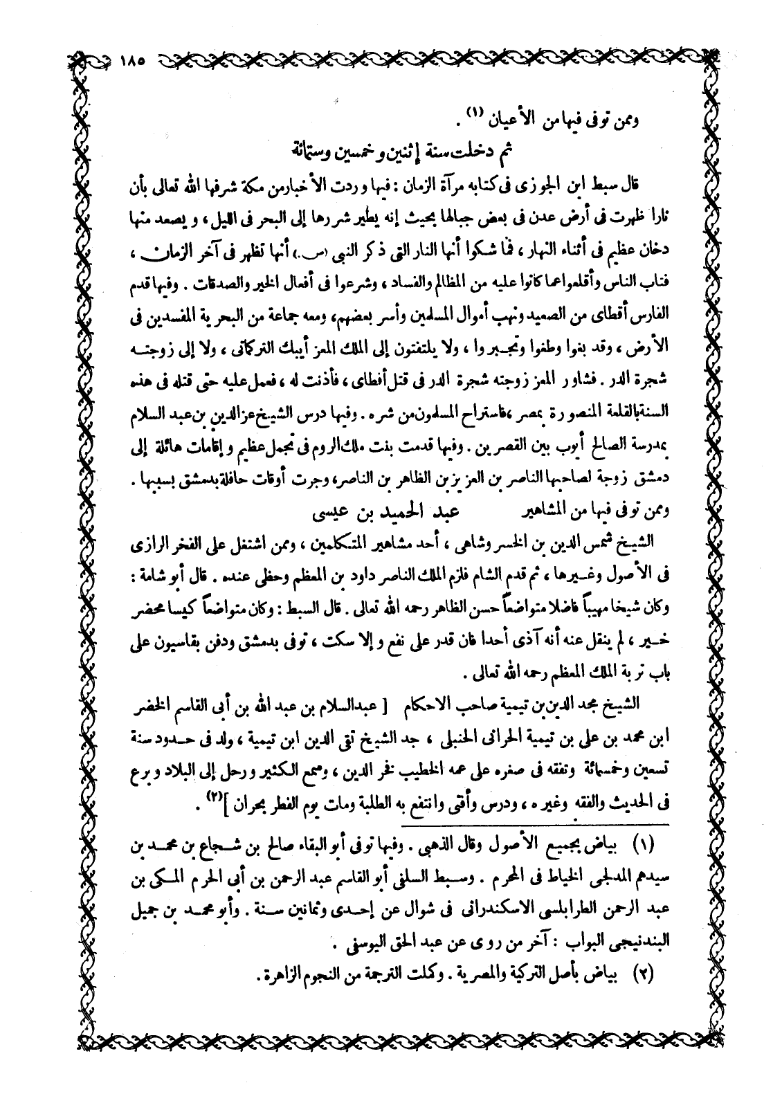 [عَبْدُ السَّلَامِ بْنُ عَبْدِ اللَّهِ بْنِ أَبِي القاسم الخضر ابن محمد بن على بن تَيْمِيَّةَ الْحَرَّانِيُّ الْحَنْبَلِيُّ، جَدُّ الشَّيْخِ تَقِيِّ الدِّينِ ابْنِ تَيْمِيَّةَ، وُلِدَ فِي حُدُودِ سَنَةِ تِسْعِينَ وَخَمْسمِائَةٍ وَتَفَقَّهَ فِي صِغَرِهِ عَلَى عَمِّهِ الْخَطِيبِ فَخْرِ الدِّينِ، وَسَمِعَ الْكَثِيرَ وَرَحَلَ إِلَى الْبِلَادِ وَبَرَعَ فِي الْحَدِيثِ وَالْفِقْهِ وَغَيْرِهِ، وَدَرَّسَ وَأَفْتَى وَانْتَفَعَ بِهِ الطَّلَبَةُ وَمَاتَ يَوْمَ الْفِطْرِ بَحَرَّانَ] [2] .