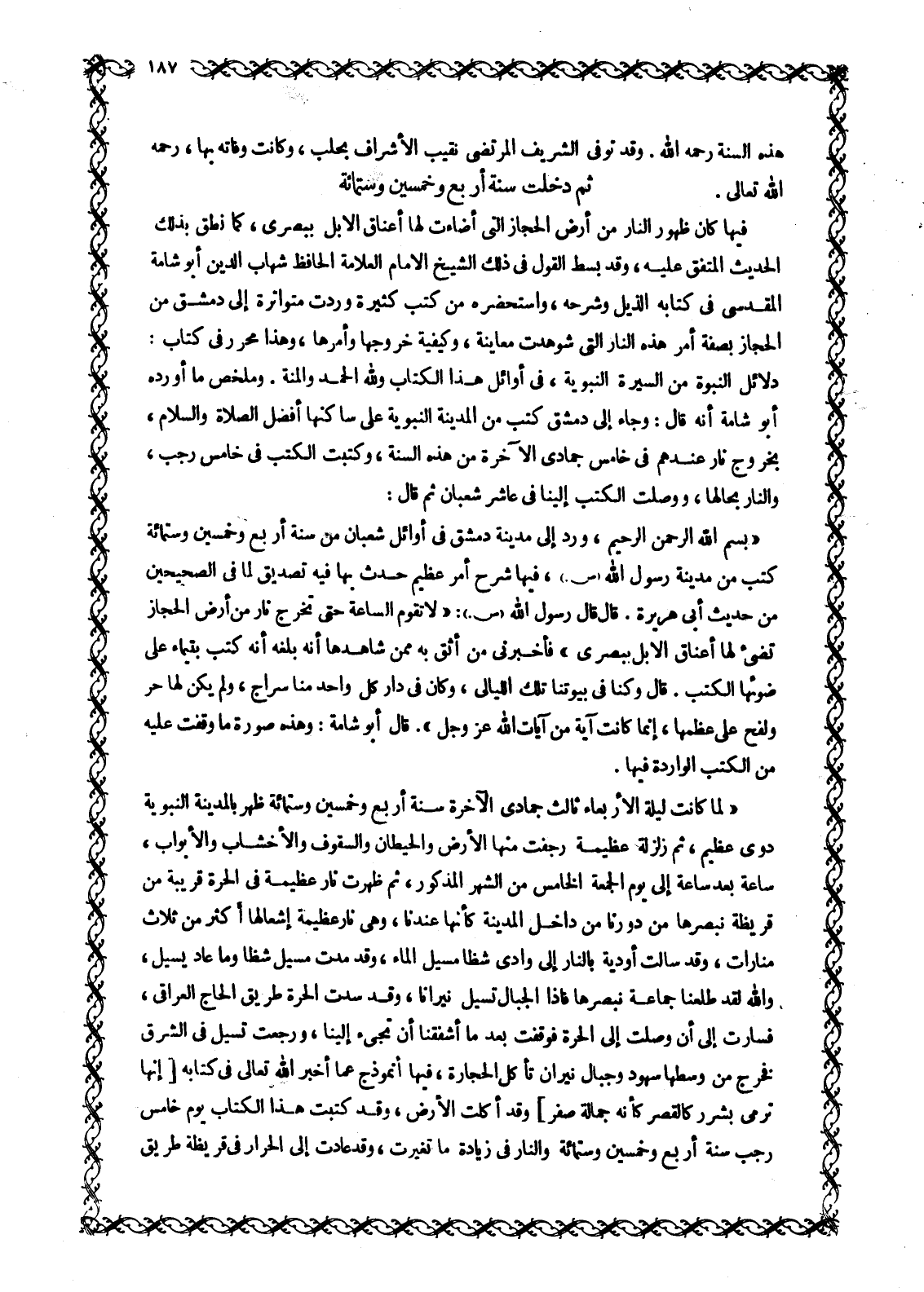 «بِسْمِ اللَّهِ الرَّحْمَنِ الرحيم، ورد إلى مدينة دمشق فِي أَوَائِلِ شَعْبَانَ مِنْ سَنَةِ أَرْبَعٍ وَخَمْسِينَ وَسِتِّمِائَةٍ كُتُبٌ مِنْ مَدِينَةِ رَسُولِ اللَّهِ صَلَّى اللَّهُ عَلَيْهِ وَسَلَّمَ، فِيهَا شَرْحُ أَمْرٍ عَظِيمٍ حَدَثَ بِهَا فِيهِ تَصْدِيقٌ لِمَا فِي الصَّحِيحَيْنِ مِنْ حَدِيثِ أَبِي هُرَيْرَةَ. قَالَ قَالَ رَسُولُ اللَّهِ صَلَّى اللَّهُ عَلَيْهِ وَسَلَّمَ: «لَا تَقُومُ السَّاعَةُ حَتَّى تَخْرُجُ نَارٌ مِنْ أَرْضِ الْحِجَازِ تُضِيءُ لَهَا أعناق الإبل ببصرى» فأخبرني مَنْ أَثِقُ بِهِ مِمَّنْ شَاهَدَهَا أَنَّهُ بَلَغَهُ أَنَّهُ كَتَبَ بِتَيْمَاءَ عَلَى ضَوْئِهَا الْكُتُبَ. قَالَ وَكُنَّا فِي بُيُوتِنَا تِلْكَ اللَّيَالِي، وَكَأَنَّ فِي دار كل واحد منا سراج، وَلَمْ يَكُنْ لَهَا حَرٌّ وَلَفْحٌ عَلَى عِظَمِهَا، إِنَّمَا كَانَتْ آيَةً مِنْ آيَاتِ اللَّهِ عَزَّ وَجَلَّ» . قَالَ أَبُو شَامَةَ: وَهَذِهِ صُورَةُ مَا وَقَفَتُ عَلَيْهِ مِنَ الْكُتُبِ الْوَارِدَةِ فِيهَا.