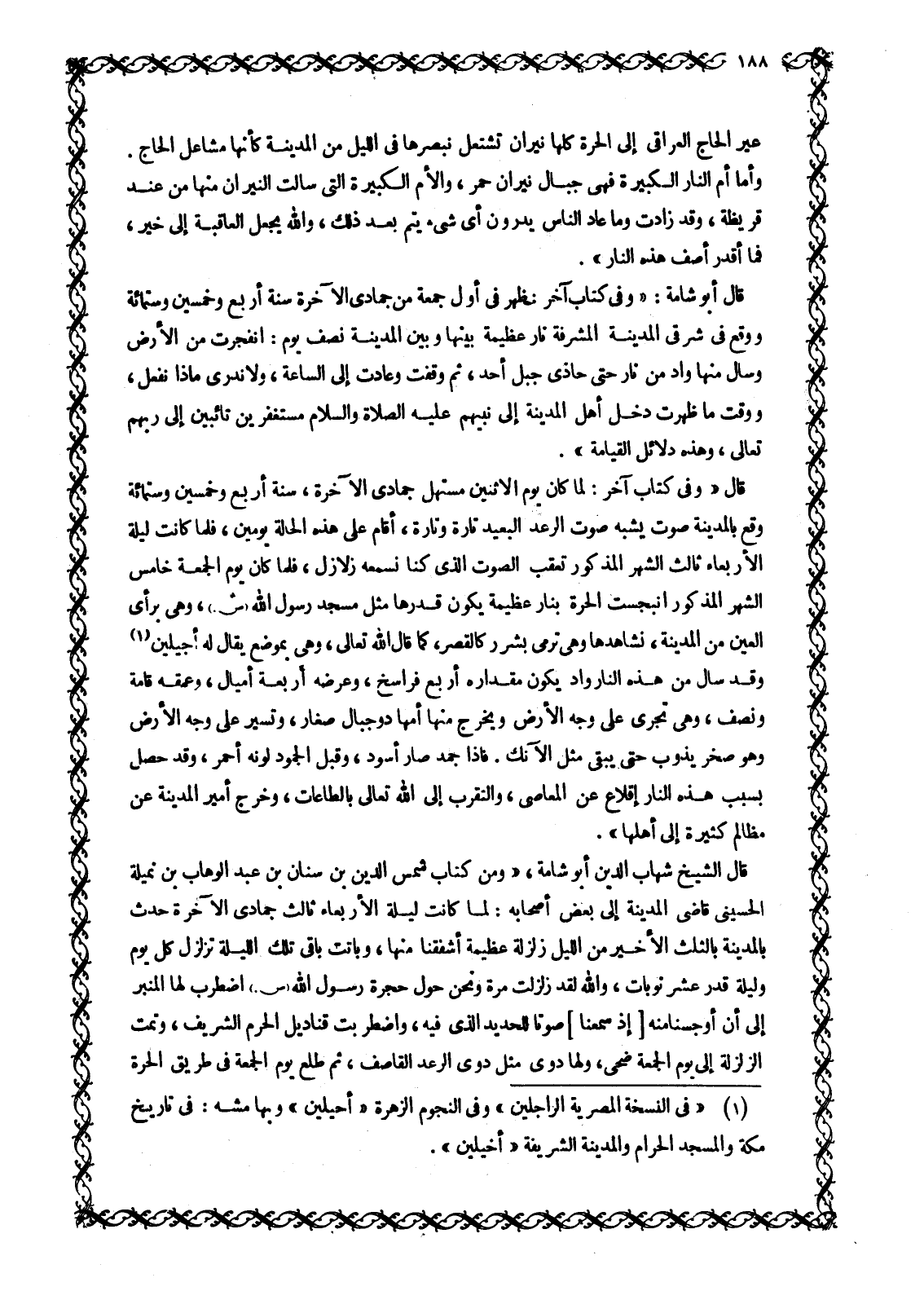 قَالَ «وَفِي كِتَابٍ آخَرَ: لَمَّا كَانَ يَوْمُ الِاثْنَيْنِ مُسْتَهَلُّ جُمَادَى الْآخِرَةِ، سَنَةَ أَرْبَعٍ وَخَمْسِينَ وَسِتِّمِائَةٍ وَقَعَ بِالْمَدِينَةِ صَوْتٌ يُشْبِهُ صَوْتَ الرَّعْدِ الْبَعِيدِ تَارَةً وَتَارَةً، أَقَامَ على هذه الحالة يَوْمَيْنِ، فَلَمَّا كَانَتْ لَيْلَةُ الْأَرْبِعَاءِ ثَالِثَ الشَّهْرِ الْمَذْكُورِ تَعَقَّبَ الصَّوْتَ الَّذِي كُنَّا نَسْمَعُهُ زَلَازِلُ، فَلَمَّا كَانَ يَوْمُ الْجُمُعَةِ خَامِسَ الشَّهْرِ الْمَذْكُورِ انْبَجَسَتِ الْحَرَّةُ بِنَارٍ عَظِيمَةٍ يَكُونُ قَدْرُهَا مِثْلَ مَسْجِدِ رَسُولِ اللَّهِ صَلَّى اللَّهُ عَلَيْهِ وَسَلَّمَ، وَهِيَ بِرَأْيِ الْعَيْنِ مِنَ الْمَدِينَةِ، نُشَاهِدُهَا وَهِيَ تَرْمِي بِشَرَرٍ كَالْقَصْرِ، كَمَا قَالَ اللَّهُ تَعَالَى، وهي بموضع يقال له أجيلين [1] وَقَدْ سَالَ مِنْ هَذِهِ النَّارِ وَادٍ يَكُونُ مقداره أربع فراسخ، وعرضه أربعة أميال، وعمقه قامة ونصف، وَهِيَ تَجْرِي عَلَى وَجْهِ الْأَرْضِ وَيَخْرُجُ مِنْهَا أَمْهَادٌ وَجِبَالٌ صِغَارٌ، وَتَسِيرُ عَلَى وَجْهِ الْأَرْضِ وَهُوَ صَخْرٌ يَذُوبُ حَتَّى يَبْقَى مِثْلَ الْآنُكِ. فَإِذَا جَمَدَ صَارَ أَسْوَدَ، وَقَبْلَ الْجُمُودِ لَوْنُهُ أَحْمَرُ، وَقَدْ حَصَلَ بِسَبَبِ هَذِهِ النَّارِ إِقْلَاعٌ عَنِ الْمَعَاصِي، وَالتَّقَرُّبِ إِلَى اللَّهِ تَعَالَى بِالطَّاعَاتِ، وَخَرَجَ أَمِيرُ الْمَدِينَةِ عَنْ مَظَالِمَ كَثِيرَةٍ إِلَى أَهْلِهَا» .