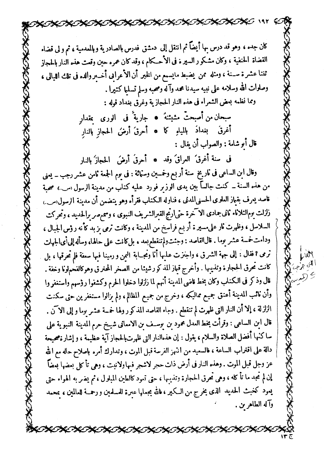 وَمِمَّا نَظَمَهُ بَعْضُ الشُّعَرَاءِ فِي هَذِهِ النَّارِ الْحِجَازِيَّةِ وَغَرَقِ بَغْدَادَ قَوْلُهُ: