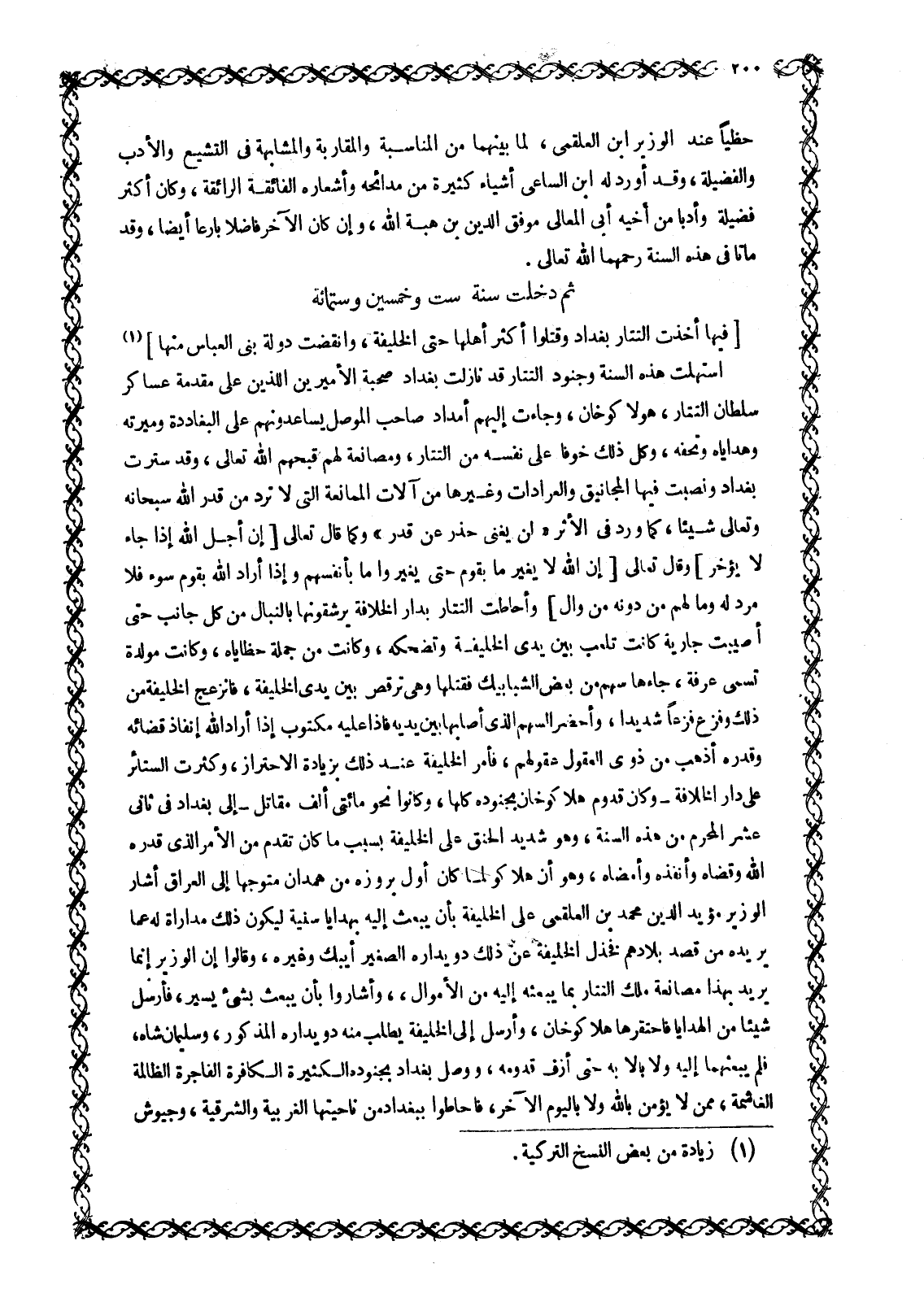 [فِيهَا أَخَذَتِ التَّتَارُ بَغْدَادَ وَقَتَلُوا أَكْثَرَ أَهْلِهَا حَتَّى الْخَلِيفَةَ، وَانْقَضَتْ دَوْلَةُ بَنِي الْعَبَّاسِ مِنْهَا] [1] اسْتَهَلَّتْ هَذِهِ السَّنَةُ وَجُنُودُ التَّتَارِ قَدْ نَازَلَتْ بَغْدَادَ صُحْبَةَ الْأَمِيرَيْنِ اللَّذَيْنِ عَلَى مُقَدِّمَةِ عَسَاكِرِ سلطان التتار، هولاكوخان، وَجَاءَتْ إِلَيْهِمْ أَمْدَادُ صَاحِبِ الْمَوْصِلِ يُسَاعِدُونَهُمْ عَلَى الْبَغَادِدَةِ وَمِيرَتُهُ وَهَدَايَاهُ وَتُحَفُهُ، وَكُلُّ ذَلِكَ خَوْفًا عَلَى نَفْسِهِ مِنَ التَّتَارِ، وَمُصَانَعَةً لَهُمْ قَبَّحَهُمُ اللَّهُ تَعَالَى، وَقَدْ سُتِرَتْ بَغْدَادُ وَنُصِبَتْ فِيهَا الْمَجَانِيقُ وَالْعَرَّادَاتُ وَغَيْرُهَا مِنْ آلَاتِ الْمُمَانَعَةِ الَّتِي لَا تَرُدُّ مِنْ قَدَرِ اللَّهِ سُبْحَانَهُ وَتَعَالَى شَيْئًا، كَمَا وَرَدَ فِي الْأَثَرِ «لَنْ يُغْنِيَ حَذَرٌ عَنْ قَدَرٍ» وَكَمَا قَالَ تَعَالَى إِنَّ أَجَلَ اللَّهِ إِذا جاءَ لَا يُؤَخَّرُ 71: 4 وَقَالَ تَعَالَى إِنَّ اللَّهَ لَا يُغَيِّرُ مَا بِقَوْمٍ حَتَّى يُغَيِّرُوا ما بِأَنْفُسِهِمْ وَإِذا أَرادَ اللَّهُ بِقَوْمٍ سُوْءاً فَلا مَرَدَّ لَهُ وَما لَهُمْ مِنْ دُونِهِ مِنْ والٍ 13: 11 وأحاطت التتار بدار الخلافة يرشقونها بالنبال مِنْ كُلِّ جَانِبٍ حَتَّى أُصِيبَتْ جَارِيَةٌ كَانَتْ تَلْعَبُ بَيْنَ يَدَيِ الْخَلِيفَةِ وَتُضْحِكُهُ، وَكَانَتْ مِنْ جملة حظاياه، وَكَانَتْ مُوَلَّدَةً تُسَمَّى عَرَفَةَ، جَاءَهَا سَهْمٌ مِنْ بَعْضِ الشَّبَابِيكِ فَقَتَلَهَا وَهِيَ تَرْقُصُ بَيْنَ يَدَيِ الْخَلِيفَةِ، فَانْزَعَجَ الْخَلِيفَةُ مِنْ ذَلِكَ وَفَزِعَ فَزَعًا شَدِيدًا، وَأَحْضَرَ السَّهْمَ الَّذِي أَصَابَهَا بَيْنَ يَدَيْهِ فَإِذَا عَلَيْهِ مَكْتُوبٌ إِذَا أَرَادَ اللَّهُ إِنْفَاذَ قضائه وقدره أذهب من ذَوِي الْعُقُولِ عُقُولَهُمْ، فَأَمَرَ الْخَلِيفَةُ عِنْدَ ذَلِكَ بزيادة الاحتراز، وكثرت الستائر على دار الخلافة- وكان قدوم هلاكوخان بِجُنُودِهِ كُلِّهَا، وَكَانُوا نَحْوَ مِائَتَيْ أَلْفِ مُقَاتِلٍ- إِلَى بَغْدَادَ فِي ثَانِي عَشَرَ الْمُحَرَّمِ مِنْ هَذِهِ السَّنَةِ، وَهُوَ شَدِيدُ الْحَنَقِ عَلَى الْخَلِيفَةِ بِسَبَبِ مَا كَانَ تَقَدَّمَ مِنَ الْأَمْرِ الَّذِي قَدَّرَهُ اللَّهُ وَقَضَاهُ وَأَنْفَذَهُ وَأَمْضَاهُ، وَهُوَ أَنَّ هلاكو لما كان أول بروزه من همدان مُتَوَجِّهًا إِلَى الْعِرَاقِ أَشَارَ الْوَزِيرُ مُؤَيِّدُ الدِّينِ مُحَمَّدُ بْنُ الْعَلْقَمِيِّ عَلَى الْخَلِيفَةِ بِأَنْ يَبْعَثَ إِلَيْهِ بِهَدَايَا سَنِيَّةٍ لِيَكُونَ ذَلِكَ مُدَارَاةً لَهُ عَمَّا يُرِيدُهُ مِنْ قَصْدِ بِلَادِهِمْ فَخَذَّلَ الْخَلِيفَةَ عَنْ ذَلِكَ دُوَيْدَارُهُ الصَّغِيرُ أَيْبَكُ وَغَيْرُهُ، وَقَالُوا إِنَّ الْوَزِيرَ إِنَّمَا يُرِيدُ بِهَذَا مُصَانَعَةَ مَلِكِ التَّتَارِ بِمَا يَبْعَثُهُ إِلَيْهِ مِنَ الْأَمْوَالِ، وَأَشَارُوا بِأَنْ يَبْعَثَ بِشَيْءٍ يَسِيرٍ، فَأَرْسَلَ شَيْئًا مِنَ الهدايا فاحتقرها هلاكوخان، وَأَرْسَلَ إِلَى الْخَلِيفَةِ يَطْلُبُ مِنْهُ دُوَيْدَارَهُ الْمَذْكُورَ، وسليمان شاه، فلم يبعثهما إليه ولا بالا بِهِ حَتَّى أَزِفَ قُدُومُهُ، وَوَصَلَ بَغْدَادَ بِجُنُودِهِ الْكَثِيرَةِ الْكَافِرَةِ الْفَاجِرَةِ الظَّالِمَةِ الْغَاشِمَةِ، مِمَّنْ لَا يُؤْمِنُ باللَّه وَلَا بِالْيَوْمِ الْآخِرِ، فَأَحَاطُوا بِبَغْدَادَ من ناحيتها الغربية والشرقية، وجيوش