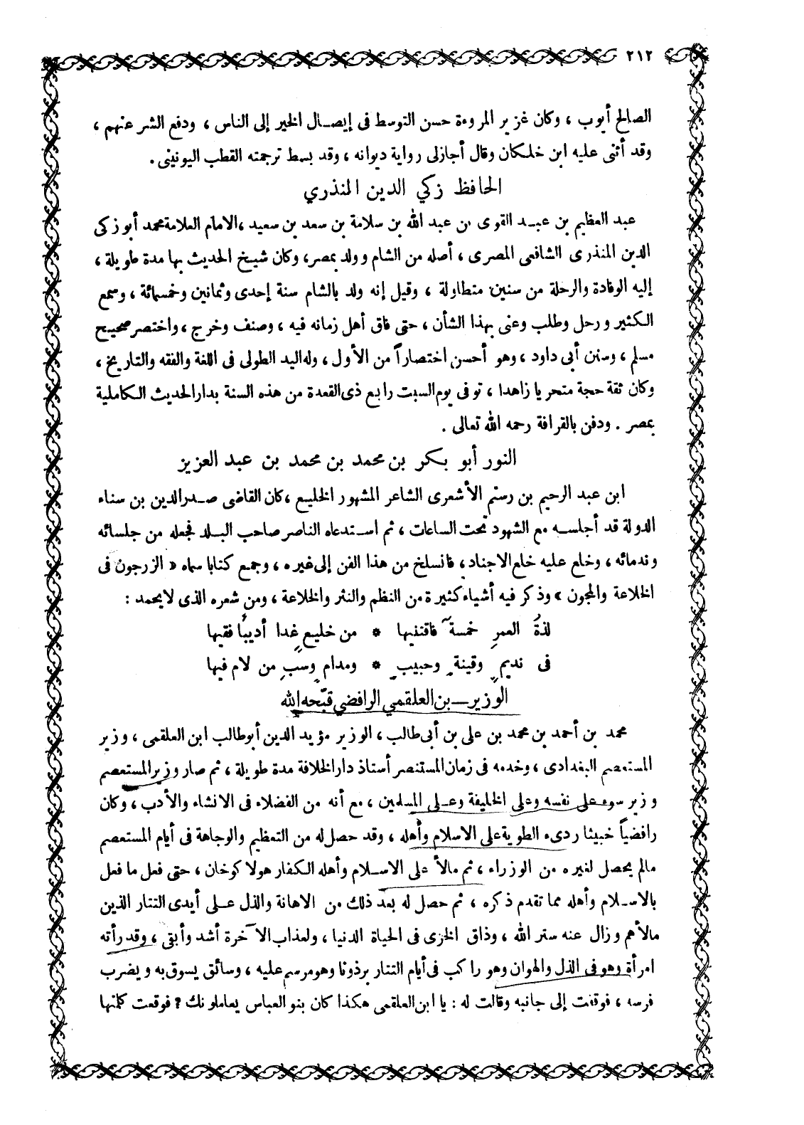 عَبْدُ الْعَظِيمِ بْنُ عَبْدِ الْقَوِيِّ بْنِ عَبْدِ اللَّهِ بْنِ سَلَامَةَ بْنِ سَعْدِ بْنِ سَعِيدٍ، الْإِمَامُ الْعَلَّامَةُ محمد أبو زكى الدين المنذري الشافعيّ المصري، أصله من الشام وولد بِمِصْرَ، وَكَانَ شَيْخَ الْحَدِيثِ بِهَا مُدَّةً طَوِيلَةً، إِلَيْهِ الْوِفَادَةُ وَالرِّحْلَةُ مِنْ سِنِينَ مُتَطَاوِلَةٍ، وَقِيلَ إِنَّهُ وُلِدَ بِالشَّامِ سَنَةَ إِحْدَى وَثَمَانِينَ وَخَمْسِمِائَةٍ، وَسَمِعَ الْكَثِيرَ وَرَحَلَ وَطَلَبَ وَعُنِيَ بِهَذَا الشَّأْنِ، حَتَّى فَاقَ أَهْلَ زَمَانِهِ فِيهِ، وَصَنَّفَ وَخَرَّجَ، وَاخْتَصَرَ صَحِيحَ مُسْلِمٍ، وَسُنَنَ أَبِي دَاوُدَ، وَهُوَ أحسن اختصارا من الأول، وله اليد الطولى فِي اللُّغَةِ وَالْفِقْهِ وَالتَّارِيخِ، وَكَانَ ثِقَةً حُجَّةً متحريا زاهدا، توفى يَوْمَ السَّبْتِ رَابِعَ ذِي الْقَعْدَةِ مِنْ هَذِهِ السَّنَةِ بِدَارِ الْحَدِيثِ الْكَامِلِيَّةِ بِمِصْرَ. وَدُفِنَ بِالْقَرَافَةِ رحمه الله تعالى.