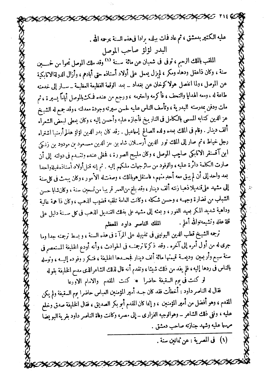 الملقب بالملك الرحيم، توفى في شعبان عَنْ مِائَةِ سَنَةٍ [1] وَقَدْ مَلَكَ الْمَوْصِلَ نَحْوًا مِنْ خَمْسِينَ سَنَةً، وَكَانَ ذَا عَقْلٍ وَدَهَاءٍ وَمَكْرٍ، لَمْ يَزَلْ يَعْمَلُ عَلَى أَوْلَادِ أُسْتَاذِهِ حتى أبادهم، وأزال الدولة الاتابكية عن الموصل، ولما انفصل هولاكوخان عَنْ بَغْدَادَ- بَعْدَ الْوَقْعَةِ الْفَظِيعَةِ الْعَظِيمَةِ- سَارَ إلى خدمته طاعة لَهُ، وَمَعَهُ الْهَدَايَا وَالتُّحَفُ، فَأَكْرَمَهُ وَاحْتَرَمَهُ، وَرَجَعَ مِنْ عِنْدِهِ فَمَكَثَ بِالْمَوْصِلِ أَيَّامًا يَسِيرَةً، ثُمَّ مَاتَ وَدُفِنَ بِمَدْرَسَتِهِ الْبَدْرِيَّةِ، وَتَأَسَّفَ النَّاسُ عَلَيْهِ لِحُسْنِ سِيرَتِهِ وَجَوْدَةِ مَعْدِلَتِهِ، وَقَدْ جَمَعَ لَهُ الشيخ عز الدين كِتَابَهُ الْمُسَمَّى بِالْكَامِلِ فِي التَّارِيخِ فَأَجَازَهُ عَلَيْهِ وَأَحْسَنَ إِلَيْهِ، وَكَانَ يُعْطِي لِبَعْضِ الشُّعَرَاءِ أَلْفَ دينار. وقام فِي الْمُلْكِ بَعْدَهُ وَلَدُهُ الصَّالِحُ إِسْمَاعِيلُ. وَقَدْ كَانَ بَدْرُ الدِّينِ لُؤْلُؤٌ هَذَا أَرْمَنِيًّا اشْتَرَاهُ رَجُلٌ خَيَّاطٌ، ثُمَّ صَارَ إِلَى الْمَلِكِ نُورِ الدِّينِ أَرْسَلَانُ شَاهْ بْنُ عِزِّ الدِّينِ مَسْعُودِ بْنِ مودود بن زنكي ابن آقْسُنْقُرَ الْأَتَابِكِيِّ صَاحِبِ الْمَوْصِلِ، وَكَانَ مَلِيحَ الصُّورَةِ، فَحَظِيَ عِنْدَهُ وَتَقَدَّمَ فِي دَوْلَتِهِ إِلَى أَنْ صَارَتِ الْكَلِمَةُ دَائِرَةً عَلَيْهِ، وَالْوُفُودُ مِنْ سَائِرِ جهات ملكهم إليه. ثم إنه قتل أولاد أستاذه غِيلَةً وَاحِدًا بَعْدَ وَاحِدٍ إِلَى أَنْ لَمْ يبق معه أحد منهم، فاستقل هو بالملك، وصفت له الأمور، وَكَانَ يَبْعَثُ فِي كُلِّ سَنَةٍ إِلَى مَشْهَدِ على قنديلا ذهبا زِنَتُهُ أَلْفُ دِينَارٍ، وَقَدْ بَلَغَ مِنَ الْعُمُرِ قَرِيبًا مِنْ تِسْعِينَ سَنَةً، وَكَانَ شَابًّا حَسَنَ الشَّبَابِ مِنْ نَضَارَةِ وَجْهِهِ، وَحُسْنِ شَكْلِهِ، وَكَانَتِ العامة تلقبه قضيب الذَّهَبِ، وَكَانَ ذَا هِمَّةٍ عَالِيَةٍ وَدَاهِيَةً شَدِيدَ المكر بعيد الغور، وبعثه إلى مشهد على بذلك القنديل الذهب في كل سنة دليل على قلة عقله وتشيعه والله أعلم.
