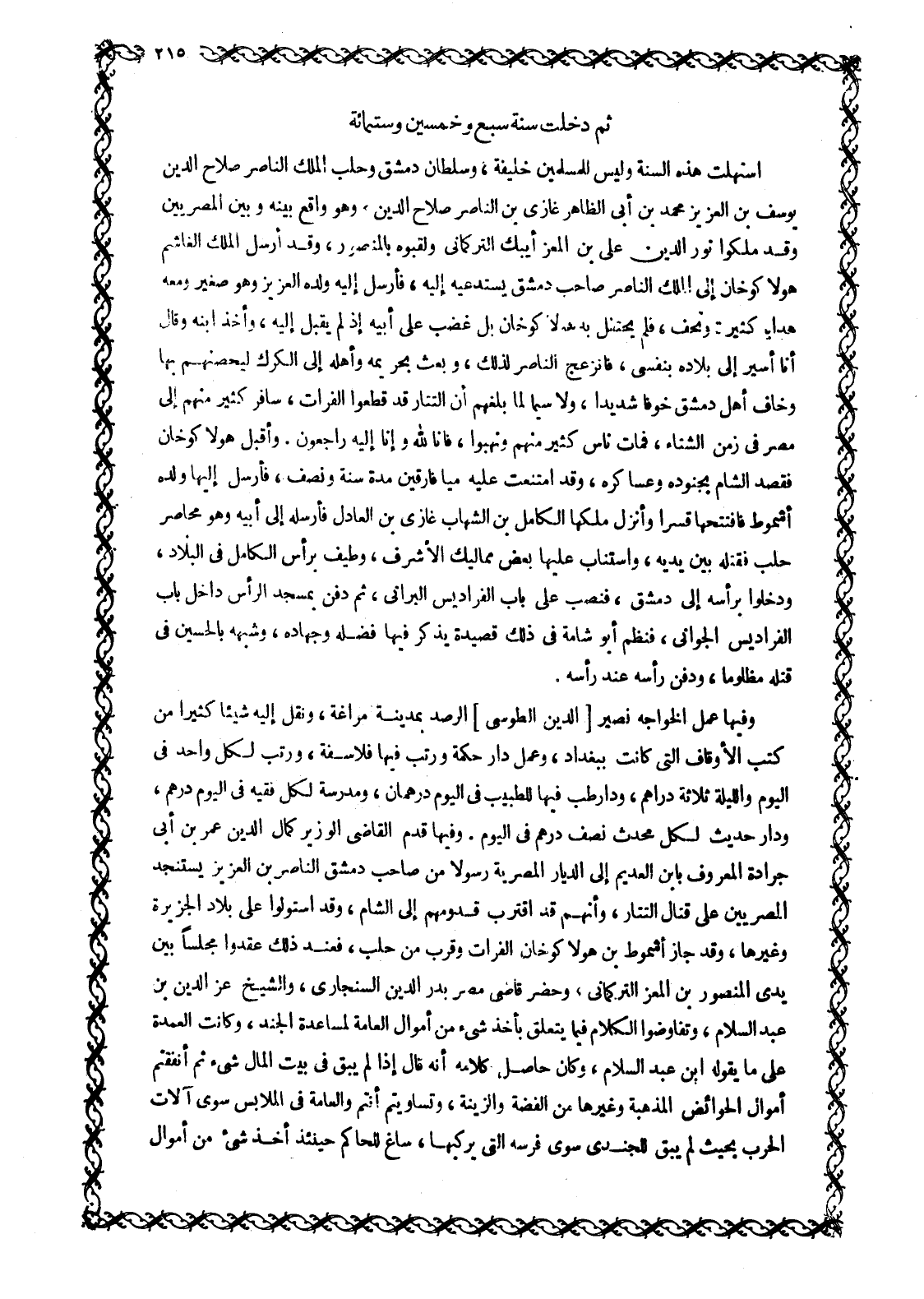 وَفِيهَا عمل الخواجه نَصِيرُ [الدِّينِ الطُّوسِيُّ] الرَّصْدَ بِمَدِينَةِ مَرَاغَةَ، وَنَقَلَ إِلَيْهِ شَيْئًا كَثِيرًا مِنْ كُتُبِ الْأَوْقَافِ الَّتِي كانت ببغداد، وعمل دار حكمة ورتب فيها فلاسفة، ورتب لكل واحد في اليوم والليلة ثلاثة دراهم، ودار طب فيها للطبيب فِي الْيَوْمِ دِرْهَمَانِ، وَمَدْرَسَةً لِكُلِّ فَقِيهٍ فِي الْيَوْمِ دِرْهَمٌ، وَدَارَ حَدِيثٍ لِكُلِّ مُحَدِّثٍ نِصْفُ دِرْهَمٍ فِي الْيَوْمِ. وَفِيهَا قَدِمَ الْقَاضِي الْوَزِيرُ كَمَالُ الدِّينِ عُمَرُ بْنُ أَبِي جَرَادَةَ الْمَعْرُوفُ بِابْنِ الْعَدِيمِ إِلَى الدِّيَارِ الْمِصْرِيَّةِ رَسُولًا مِنْ صَاحِبِ دِمَشْقَ النَّاصِرِ بْنِ الْعَزِيزِ يَسْتَنْجِدُ الْمِصْرِيِّينَ على قتال التتار، وأنهم قَدِ اقْتَرَبَ قُدُومُهُمْ إِلَى الشَّامِ، وَقَدِ اسْتَوْلَوْا على بلاد الجزيرة وغيرها، وقد جاز أشموط بن هولاكوخان الفرات وقرب من حلب، فعند ذلك عقدوا مجلسا بَيْنَ يَدَيِ الْمَنْصُورِ بْنِ الْمُعِزِّ التُّرْكُمَانِيِّ، وَحَضَرَ قَاضِي مِصْرَ بَدْرُ الدِّينِ السِّنْجَارِيُّ، وَالشَّيْخُ عِزُّ الدين بن عبد السلام، وتفاوضوا الْكَلَامَ فِيمَا يَتَعَلَّقُ بِأَخْذِ شَيْءٍ مِنْ أَمْوَالِ الْعَامَّةِ لِمُسَاعَدَةِ الْجُنْدِ، وَكَانَتِ الْعُمْدَةَ عَلَى مَا يقوله ابن عبد السلام، وكان حاصل كلامه أنه قال إِذَا لَمْ يَبْقَ فِي بَيْتِ الْمَالِ شَيْءٌ ثم أنفقتم أموال الحوائض المذهبة وغيرها من الفضة والزينة، وَتَسَاوَيْتُمْ أَنْتُمْ وَالْعَامَّةُ فِي الْمَلَابِسِ سِوَى آلَاتِ الحرب بحيث لم يبق للجندى سوى فرسه التي يركبها، ساغ للحاكم حينئذ أَخْذُ شَيْءٍ مِنْ أَمْوَالِ