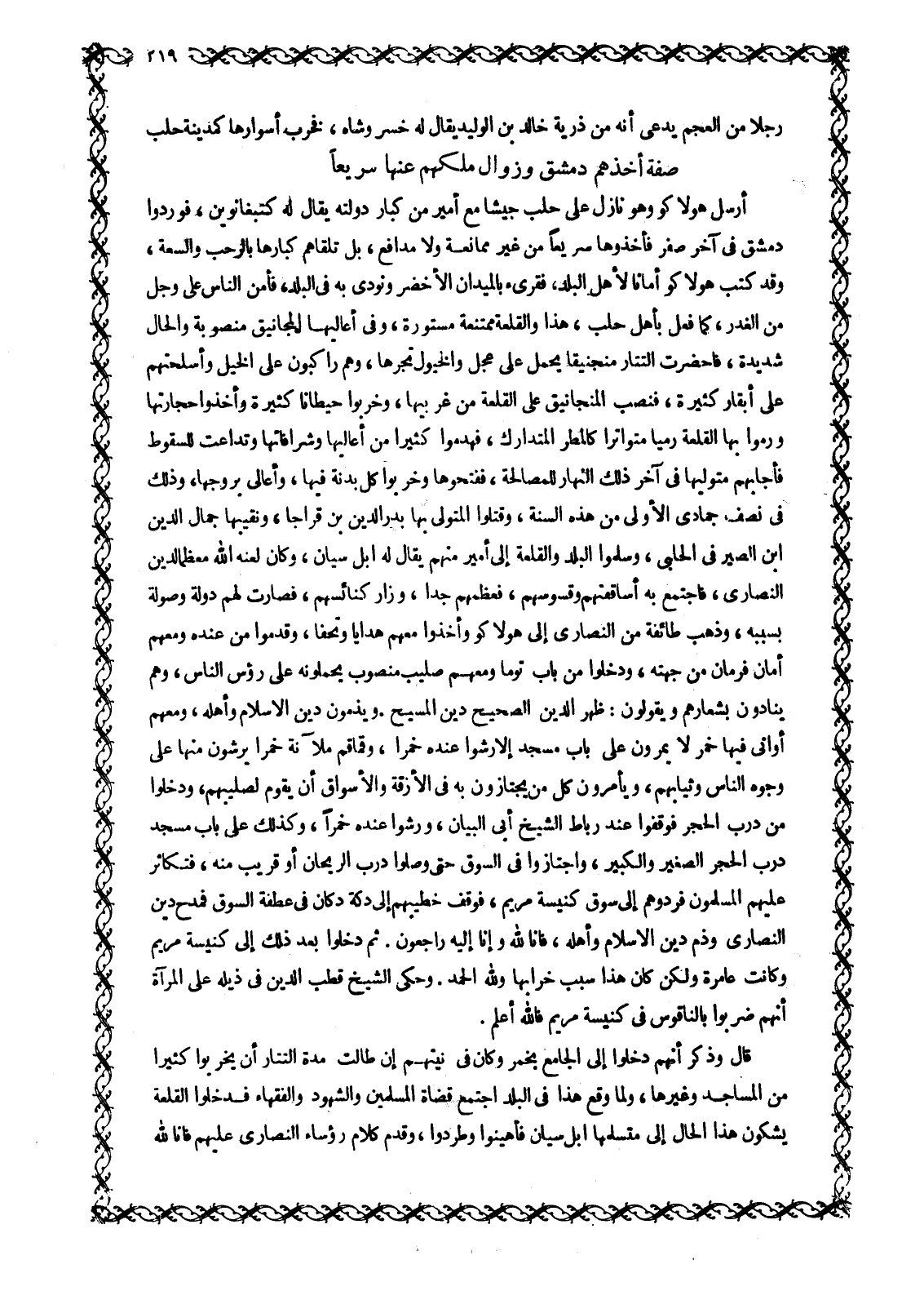 قَالَ وَذَكَرَ أَنَّهُمْ دَخَلُوا إلى الجامع بخمر وكان في نِيَّتِهِمْ إِنْ طَالَتْ مُدَّةُ التَّتَارِ أَنْ يُخَرِّبُوا كثيرا من المساجد وغيرها، وَلَمَّا وَقَعَ هَذَا فِي الْبَلَدِ اجْتَمَعَ قُضَاةُ الْمُسْلِمِينَ وَالشُّهُودُ وَالْفُقَهَاءُ فَدَخَلُوا الْقَلْعَةَ يَشْكُونَ هَذَا الحال إلى متسلمها إبل سيان فَأُهِينُوا وَطُرِدُوا، وَقَدَّمَ كَلَامَ رُؤَسَاءِ النَّصَارَى عَلَيْهِمْ ف إِنَّا لِلَّهِ