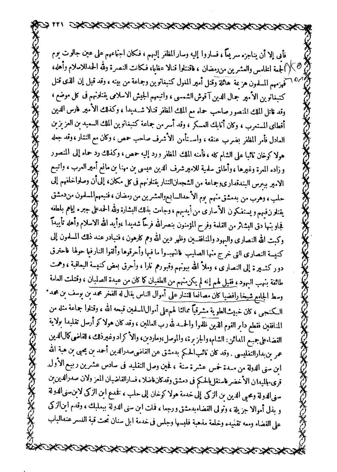 فأبى إلا أن يناجزه سريعا، فساروا إليه وسار المظفر إليهم، فَكَانَ اجْتِمَاعُهُمْ عَلَى عَيْنِ جَالُوتَ يَوْمَ الْجُمُعَةِ الْخَامِسَ وَالْعِشْرِينَ مِنْ رَمَضَانَ، فَاقْتَتَلُوا قِتَالًا عَظِيمًا، فَكَانَتِ النُّصْرَةُ وللَّه الْحَمْدُ لِلْإِسْلَامِ وَأَهْلِهِ، فَهَزَمَهُمُ المسلمون هزيمة هائلة وقتل أمير المغول كتبغانوين وجماعة من بيته، وقد قيل إن الّذي قتل كتبغانوين الْأَمِيرُ جَمَالُ الدِّينِ آقُوشُ الشَّمْسِيُّ، وَاتَّبَعَهُمُ الْجَيْشُ الإسلامي يقتلونهم في كل موضع، وَقَدْ قَاتَلَ الْمَلِكُ الْمَنْصُورُ صَاحِبُ حَمَاةَ مَعَ الملك المظفر قتالا شديدا، وَكَذَلِكَ الْأَمِيرُ فَارِسُ الدِّينِ أَقَطَايَ الْمُسْتَعْرِبُ، وَكَانَ أتابك العسكر، وقد أسر من جماعة كتبغانوين الْمَلِكُ السَّعِيدُ بْنُ الْعَزِيزِ بْنِ الْعَادِلِ فَأَمَرَ الْمُظَفَّرُ بِضَرْبِ عُنُقِهِ، وَاسْتَأْمَنَ الْأَشْرَفُ صَاحِبُ حِمْصَ، وكان مع التتار، وقد جعله هولاكوخان نَائِبًا عَلَى الشَّامِ كُلِّهِ، فَأَمَّنَهُ الْمَلِكُ الْمُظَفَّرُ وَرَدَّ إِلَيْهِ حِمْصَ، وَكَذَلِكَ رَدَّ حَمَاةَ إِلَى الْمَنْصُورِ وَزَادَهُ الْمَعَرَّةَ وَغَيْرَهَا، وَأَطْلَقَ سَلَمْيَةَ لِلْأَمِيرِ شَرَفِ الدِّينِ عِيسَى بْنِ مُهَنَّا بْنِ مَانِعٍ أمير العرب، واتبع الأمير بِيبَرْسُ الْبُنْدُقْدَارِيُّ وَجَمَاعَةٌ مِنَ الشُّجْعَانِ التَّتَارَ يَقْتُلُونَهُمْ فِي كُلِّ مَكَانٍ، إِلَى أَنْ وَصَلُوا خَلْفَهُمْ إلى حلب، وهرب من بدمشق منهم يوم الأحد السابع والعشرين من رمضان، فتبعهم المسلمون من دمشق يقتلون فيهم ويستفكون الأسارى من أيديهم، وجاءت بذلك البشارة وللَّه الحمد على جبره إياهم بلطفه فجاوبتها دق البشائر من القلعة وفرح المؤمنون بِنَصْرِ اللَّهِ فَرَحًا شَدِيدًا، وَأَيْدَ اللَّهُ الْإِسْلَامَ وأهله تأييدا وكبت الله النصارى واليهود والمنافقين وظهر دين الله وهم كارهون، فَتَبَادَرَ عِنْدَ ذَلِكَ الْمُسْلِمُونَ إِلَى كَنِيسَةِ النَّصَارَى الَّتِي خَرَجَ مِنْهَا الصَّلِيبُ فَانْتَهَبُوا مَا فِيهَا وأحرقوها وألقوا النار فيما حولها فاحترق دور كثيرة إلى النصارى، وَمَلَأَ اللَّهُ بُيُوتَهُمْ وَقُبُورَهُمْ نَارًا، وَأَحْرَقَ بَعْضَ كَنِيسَةِ الْيَعَاقِبَةِ، وَهَمَّتْ طَائِفَةٌ بِنَهْبِ الْيَهُودِ، فَقِيلَ لهم إنه لم يكن منهم من الطغيان كما كان من عبدة الصلبان، وقتلت العامة وَسَطِ الْجَامِعِ شَيْخًا رَافِضِيًّا كَانَ مُصَانِعًا لِلتَّتَارِ عَلَى أَمْوَالِ النَّاسِ يُقَالُ لَهُ الْفَخْرُ مُحَمَّدُ بن يوسف بن محمد الْكَنْجِيُّ، كَانَ خَبِيثَ الطَّوِيَّةِ مَشْرِقِيًّا مُمَالِئًا لَهُمْ على أموال المسلمين قبحه الله، وقتلوا جماعة مثله من المنافقين فَقُطِعَ دابِرُ الْقَوْمِ الَّذِينَ ظَلَمُوا وَالْحَمْدُ لِلَّهِ رَبِّ الْعالَمِينَ، 6: 45 وقد كان هُولَاكُو أَرْسَلَ تَقْلِيدًا بِوِلَايَةِ الْقَضَاءِ عَلَى جَمِيعِ المدائن: الشام، والجزيرة، والموصل، وماردين، وَالْأَكْرَادِ وَغَيْرِ ذَلِكَ، لِلْقَاضِي كَمَالِ الدِّينِ عُمَرَ بن بدار التَّفْلِيسِيِّ. وَقَدْ كَانَ نَائِبَ الْحُكْمِ بِدِمَشْقَ عَنِ الْقَاضِي صَدَرِ الدِّينِ أَحْمَدَ بْنِ يَحْيَى بْنِ هبة الله ابن سَنِيِّ الدَّوْلَةِ مِنْ مُدَّةِ خَمْسَ عَشْرَةَ سَنَةً، فحين وصل التقليد في سادس عشرين رَبِيعٍ الْأَوَّلِ قُرِئَ بِالْمَيْدَانِ الْأَخْضَرِ فَاسْتَقَلَّ بِالْحُكْمِ في دمشق وقد كان فاضلا، فَسَارَ الْقَاضِيَانِ الْمَعْزُولَانِ صَدْرُ الدِّينِ بْنُ سَنِيِّ الدَّوْلَةِ وَمُحْيِي الدِّينِ بْنُ الزَّكِيِّ إِلَى خِدْمَةِ هولاكوخان إلى حلب، فَخَدَعَ ابْنُ الزَّكِيِّ لِابْنِ سَنِيِّ الدَّوْلَةِ وَبَذَلَ أموالا جزيلة، وَتَوَلَّى الْقَضَاءَ بِدِمَشْقَ وَرَجَعَا، فَمَاتَ ابْنُ سَنِيِّ ال