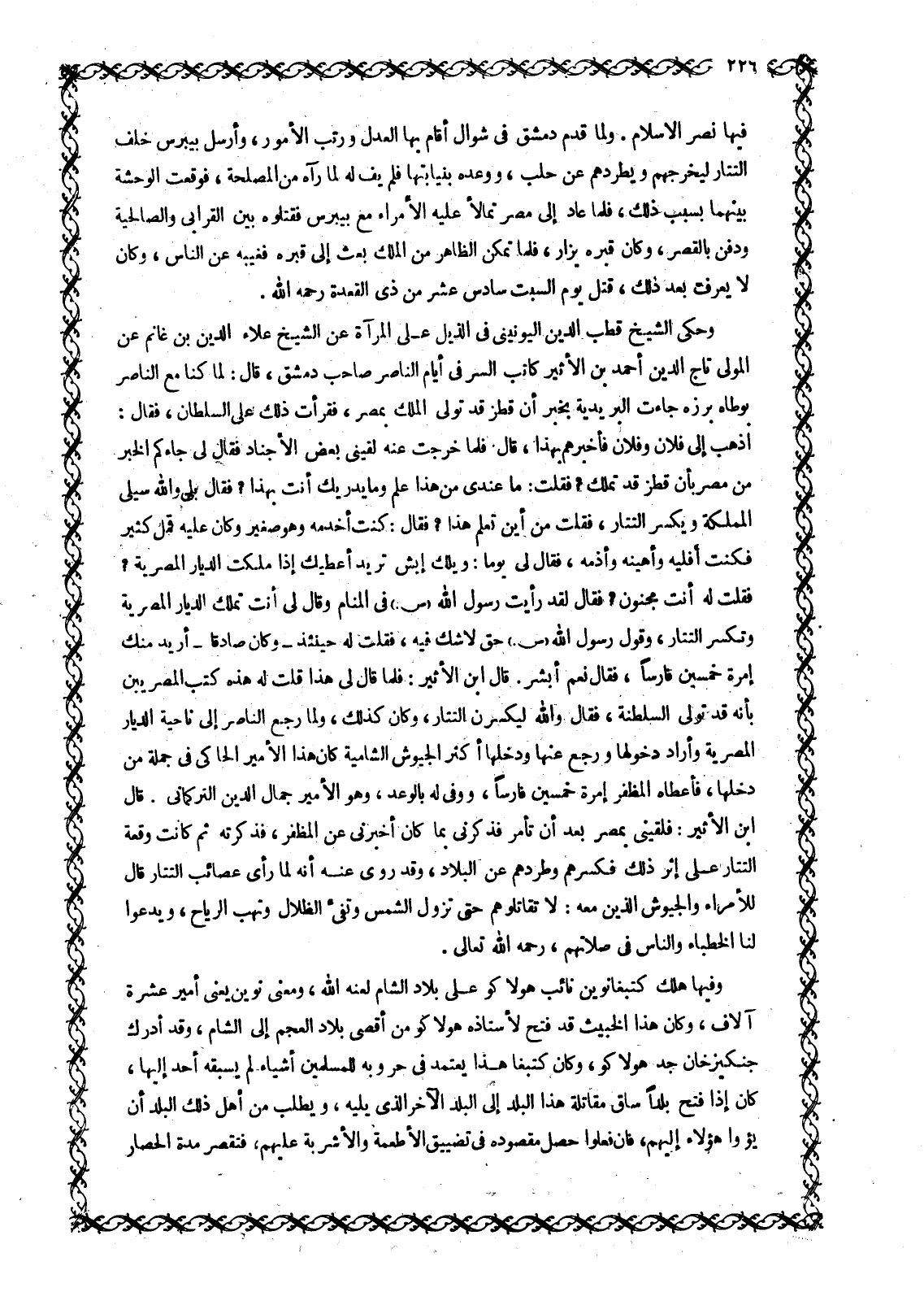 فيها نصر الإسلام. وَلَمَّا قَدِمَ دِمَشْقَ فِي شَوَّالٍ أَقَامَ بِهَا العدل ورتب الأمور، وأرسل بيبرس خَلْفَ التَّتَارِ لِيُخْرِجَهُمْ وَيَطْرُدَهُمْ عَنْ حَلْبَ، وَوَعْدَهُ بنيابتها فلم يف له لما رآه من المصلحة، فَوَقَعَتِ الْوَحْشَةُ بَيْنَهُمَا بِسَبَبِ ذَلِكَ، فَلَمَّا عَادَ إلى مصر تمالأ عليه الأمراء مع بيبرس فقتلوه بين القرابى وَالصَّالِحِيَّةِ وَدُفِنَ بِالْقَصْرِ، وَكَانَ قَبْرُهُ يُزَارُ، فَلَمَّا تَمَكَّنَ الظَّاهِرُ مِنِ الْمُلْكِ بَعَثَ إِلَى قَبْرِهِ فغيبه عن الناس، وكان لا يعرف بعد ذلك، قتل يَوْمَ السَّبْتِ سَادِسَ عَشَرَ مِنْ ذِي الْقَعْدَةِ رحمه الله.