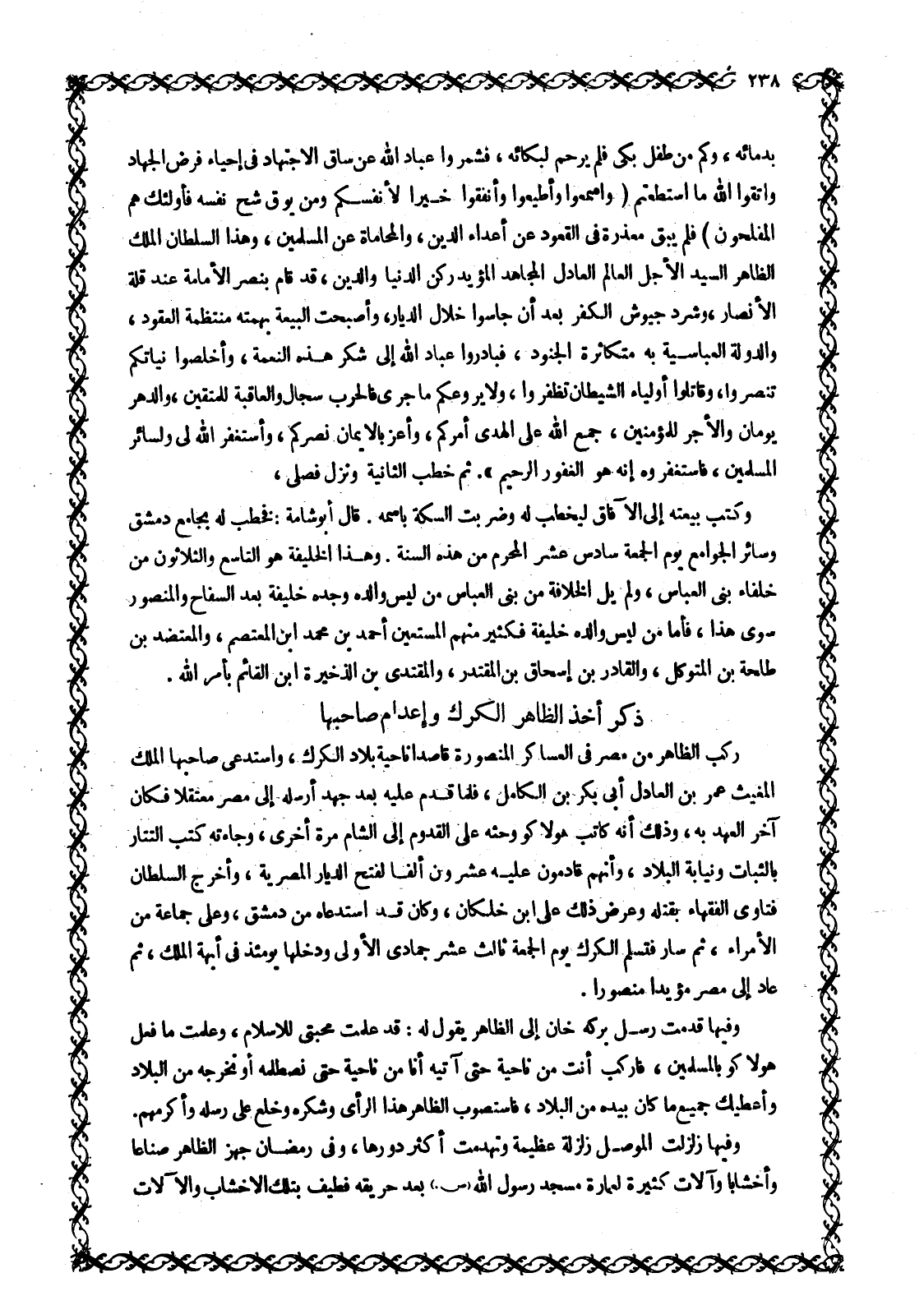 بِدِمَائِهِ، وَكَمْ مِنْ طِفْلٍ بَكَى فَلَمْ يُرْحَمْ لبكائه، فشمروا عباد الله عَنْ سَاقِ الِاجْتِهَادِ فِي إِحْيَاءِ فَرْضِ الْجِهَادِ فَاتَّقُوا اللَّهَ مَا اسْتَطَعْتُمْ 64: 16 وَاسْمَعُوا وَأَطِيعُوا وَأَنْفِقُوا خَيْراً لِأَنْفُسِكُمْ وَمن يُوقَ شُحَّ نَفْسِهِ فَأُولئِكَ هُمُ الْمُفْلِحُونَ 64: 16 فَلَمْ يَبْقَ مَعْذِرَةٌ فِي الْقُعُودِ عَنْ أَعْدَاءِ الدِّينِ، وَالْمُحَامَاةِ عَنِ الْمُسْلِمِينَ، وَهَذَا السُّلْطَانُ الْمَلِكُ الظَّاهِرُ السَّيِّدُ الْأَجَلُّ الْعَالِمُ الْعَادِلُ الْمُجَاهِدُ الْمُؤَيَّدُ رُكْنُ الدُّنْيَا وَالدِّينِ، قَدْ قَامَ بِنَصْرِ الْإِمَامَةِ عِنْدَ قِلَّةِ الْأَنْصَارِ، وَشَرَّدَ جُيُوشَ الْكُفْرِ بَعْدَ أن جاسوا خلال الديار، وأصبحت البيعة بهمته مُنْتَظِمَةَ الْعُقُودِ، وَالدَّوْلَةُ الْعَبَّاسِيَّةُ بِهِ مُتَكَاثِرَةَ الْجُنُودِ، فَبَادِرُوا عِبَادَ اللَّهِ إِلَى شُكْرِ هَذِهِ النِّعْمَةِ، وَأَخْلِصُوا نِيَّاتِكُمْ تُنْصَرُوا، وَقَاتَلُوا أَوْلِيَاءَ الشَّيْطَانِ تَظْفَرُوا، وَلَا يُرَوِّعُكُمْ مَا جَرَى فَالْحَرْبُ سِجَالٌ وَالْعَاقِبَةُ للمتقين، والدهر يومان والأجر للمؤمنين، جميع اللَّهُ عَلَى الْهُدَى أَمْرَكُمْ، وَأَعَزَّ بِالْإِيمَانِ نَصْرَكُمْ، وأستغفر الله لي وَلِسَائِرِ الْمُسْلِمِينَ، فَاسْتَغْفِرُوهُ إِنَّهُ هُوَ الْغَفُورُ الرَّحِيمُ» . ثُمَّ خَطَبَ الثَّانِيَةَ وَنَزَلَ فَصَلَّى، وَكَتَبَ بَيْعَتَهُ إِلَى الْآفَاقِ لِيُخْطَبَ لَهُ وَضُرِبَتِ السِّكَّةُ بِاسْمِهِ. قَالَ أَبُو شَامَةَ: فَخُطِبَ لَهُ بِجَامِعِ دِمَشْقَ وَسَائِرِ الْجَوَامِعِ يَوْمَ الْجُمُعَةِ سَادِسَ عَشَرَ الْمُحَرَّمِ مِنْ هَذِهِ السَّنَةِ. وَهَذَا الْخَلِيفَةُ هُوَ التَّاسِعُ وَالثَّلَاثُونَ مِنْ خُلَفَاءِ بَنِي الْعَبَّاسِ، وَلَمْ يَلِ الْخِلَافَةَ مِنْ بَنِي الْعَبَّاسِ مَنْ لَيْسَ وَالِدُهُ وَجَدُّهُ خَلِيفَةً بَعْدَ السَّفَّاحِ وَالْمَنْصُورِ سِوَى هَذَا، فَأَمَّا مَنْ لَيْسَ وَالِدُهُ خَلِيفَةً فَكَثِيرٌ مِنْهُمُ المستعين أحمد بن محمد ابن الْمُعْتَصِمِ، وَالْمُعْتَضِدُ بْنُ طَلْحَةَ بْنِ الْمُتَوَكِّلِ، وَالْقَادِرُ بْنُ إِسْحَاقَ بْنِ الْمُقْتَدِرِ، وَالْمُقْتَدِي بْنُ الذَّخِيرَةِ ابن الْقَائِمِ بِأَمْرِ اللَّهِ.