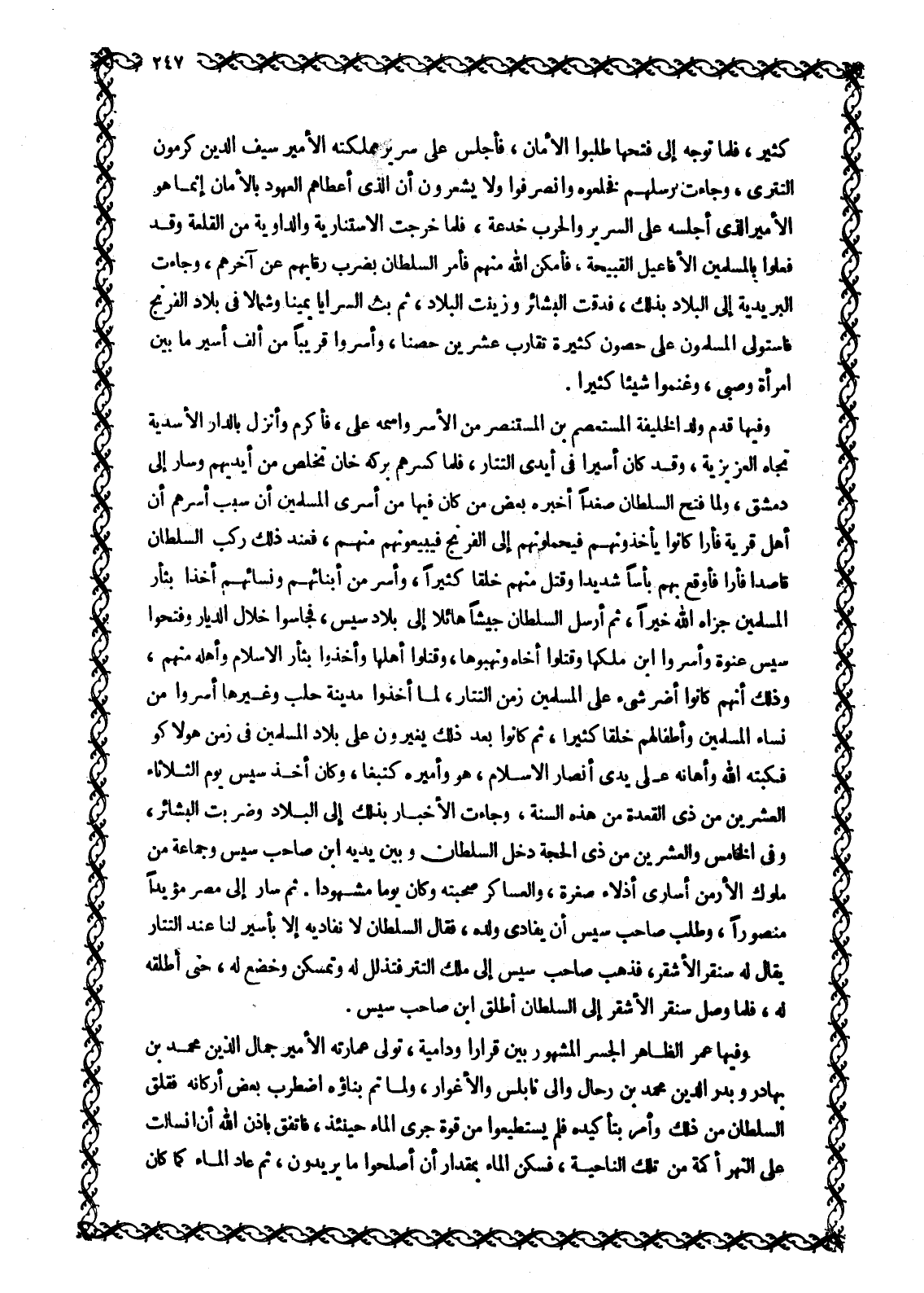وَفِيهَا قَدِمَ وَلَدُ الْخَلِيفَةِ الْمُسْتَعْصِمِ بْنِ الْمُسْتَنْصِرِ من الأسر واسمه على، فأكرم وأنزل بالدار الأسدية تجاه الْعَزِيزِيَّةِ، وَقَدْ كَانَ أَسِيرًا فِي أَيْدِي التَّتَارِ، فَلَمَّا كَسَرَهُمْ بَرَكَةُ خَانَ تَخَلَّصَ مِنْ أَيْدِيهِمْ وسار إلى دمشق، ولما فتح السلطان صغدا أخبره بعض من كان فيها مَنْ أَسْرَى الْمُسْلِمِينَ أَنَّ سَبَبَ أَسْرِهِمْ أَنَّ أهل قرية فأرا كَانُوا يَأْخُذُونَهُمْ فَيَحْمِلُونَهُمْ إِلَى الْفِرِنْجِ فَيَبِيعُونَهُمْ مِنْهُمْ، فعند ذلك ركب السلطان قاصدا فأرا فَأَوْقَعَ بِهِمْ بَأْسًا شَدِيدًا وَقَتَلَ مِنْهُمْ خَلْقَا كَثِيرًا، وَأَسَرَ مِنْ أَبْنَائِهِمْ وَنِسَائِهِمْ أَخْذًا بِثَأْرِ الْمُسْلِمِينَ جَزَاهُ اللَّهُ خَيْرًا، ثُمَّ أَرْسَلَ السُّلْطَانُ جَيْشًا هَائِلًا إِلَى بِلَادِ سِيسَ، فَجَاسُوا خِلَالَ الدِّيَارِ وَفَتَحُوا سِيسَ عَنْوَةً وَأَسَرُوا ابْنَ مَلِكِهَا وَقَتَلُوا أَخَاهُ وَنَهَبُوهَا، وَقَتَلُوا أَهْلَهَا وَأَخَذُوا بِثَأْرِ الْإِسْلَامِ وَأَهْلِهِ مِنْهُمْ، وَذَلِكَ أَنَّهُمْ كَانُوا أَضَرَّ شَيْءٍ عَلَى الْمُسْلِمِينَ زَمَنَ التَّتَارِ، لَمَّا أَخَذُوا مَدِينَةَ حَلَبَ وَغَيْرَهَا أَسَرُوا مِنْ نِسَاءِ الْمُسْلِمِينَ وأطفالهم خلقا كثيرا، ثُمَّ كَانُوا بَعْدَ ذَلِكَ يُغِيرُونَ عَلَى بِلَادِ الْمُسْلِمِينَ فِي زَمَنِ هُولَاكُو فَكَبَتَهُ اللَّهُ وَأَهَانَهُ على يدي أنصار الإسلام، هو وأميره كتبغا، وكان أخذ سيس يَوْمِ الثُّلَاثَاءِ الْعِشْرِينَ مِنْ ذِي الْقَعْدَةِ مِنْ هَذِهِ السَّنَةِ، وَجَاءَتِ الْأَخْبَارُ بِذَلِكَ إِلَى الْبِلَادِ وَضُرَبَتِ الْبَشَائِرُ، وَفِي الْخَامِسِ وَالْعِشْرِينَ مِنْ ذِي الحجة دخل السلطان وَبَيْنَ يَدَيْهِ ابْنُ صَاحِبِ سِيسَ وَجَمَاعَةٌ مِنْ مُلُوكِ الْأَرْمَنِ أُسَارَى أَذِلَّاءَ صَغَرَةً، وَالْعَسَاكِرُ صُحْبَتُهُ وكان يوما مشهودا. ثم سار إلى مصر مؤيدا منصورا، وطلب صاحب سيس أن يفادى ولده، فقال السلطان لَا نُفَادِيهِ إِلَّا بِأَسِيرٍ لَنَا عِنْدَ التَّتَارِ يُقَالُ لَهُ سُنْقُرَ الْأَشْقَرَ، فَذَهَبً صَاحِبُ سِيسَ إلى ملك التتر فتذلل له وتمسكن وخضع له، حتى أطلقه له، فلما وصل سنقر الأشقر إلى السلطان أطلق ابْنَ صَاحِبِ سِيسَ.