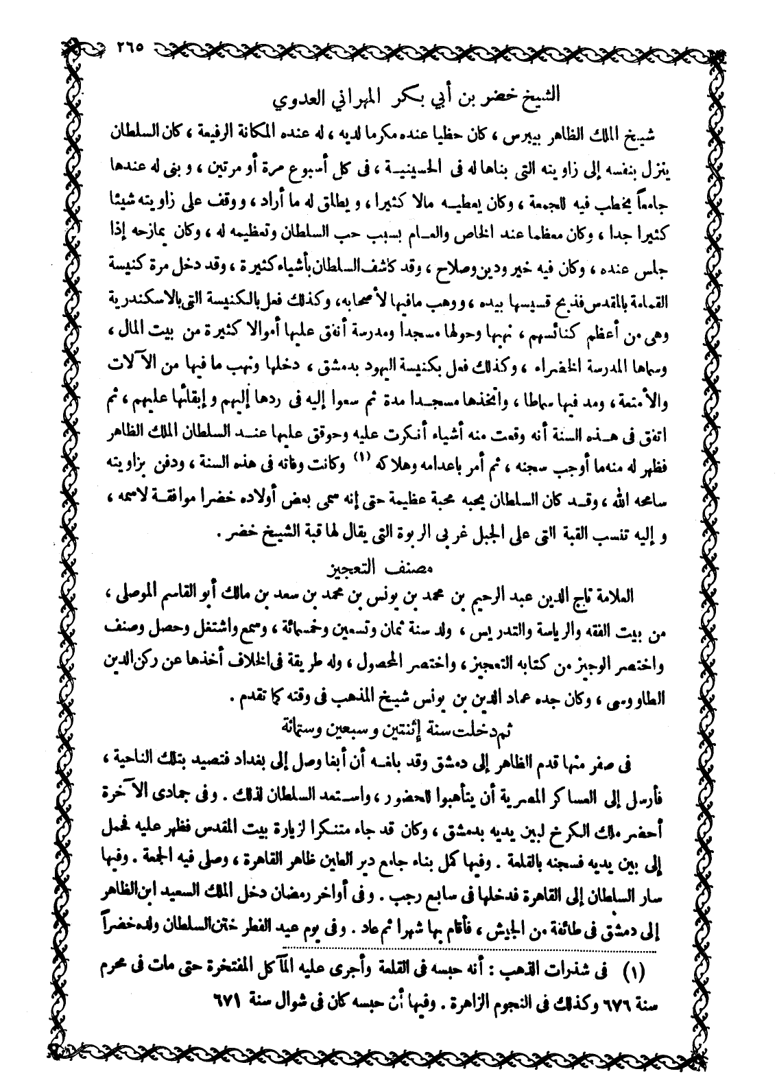 شَيْخُ الْمَلِكِ الظَّاهِرِ بَيْبَرْسَ، كَانَ حَظِيًّا عِنْدَهُ مُكْرَمًا لَدَيْهِ، لَهُ عِنْدَهُ الْمَكَانَةُ الرَّفِيعَةُ، كَانَ السُّلْطَانُ يَنْزِلُ بِنَفْسِهِ إِلَى زَاوِيَتِهِ الَّتِي بَنَاهَا لَهُ فِي الْحُسَيْنِيَّةِ، فِي كُلِّ أُسْبُوعٍ مَرَّةً أَوْ مَرَّتَيْنِ، وَبَنَى لَهُ عِنْدَهَا جَامِعًا يَخْطُبُ فِيهِ لِلْجُمُعَةِ، وَكَانَ يُعْطِيهِ مَالًا كَثِيرًا، وَيُطْلِقُ لَهُ مَا أَرَادَ، وَوَقَفَ عَلَى زَاوِيَتِهِ شَيْئًا كَثِيرًا جِدًّا، وَكَانَ مُعَظَّمًا عِنْدَ الْخَاصِّ وَالْعَامِّ بِسَبَبِ حُبِّ السُّلْطَانِ وَتَعْظِيمِهِ لَهُ، وَكَانَ يُمَازِحُهُ إِذَا جَلَسَ عِنْدَهُ، وَكَانَ فِيهِ خَيْرٌ وَدِينٌ وَصَلَاحٌ، وَقَدْ كَاشَفَ السُّلْطَانَ بِأَشْيَاءَ كَثِيرَةٍ، وَقَدْ دَخَلَ مَرَّةً كَنِيسَةَ الْقُمَامَةِ بِالْمَقْدِسِ فَذَبَحَ قِسِّيسَهَا بِيَدِهِ، وَوَهَبَ مَا فِيهَا لِأَصْحَابِهِ، وَكَذَلِكَ فَعَلَ بِالْكَنِيسَةِ الَّتِي بِالْإِسْكَنْدَرِيَّةِ وَهِيَ مَنْ أَعْظَمِ كَنَائِسِهِمْ، نَهَبَهَا وَحَوَّلَهَا مَسْجِدًا وَمَدْرَسَةً أَنْفَقَ عَلَيْهَا أَمْوَالًا كَثِيرَةً مِنْ بَيْتِ الْمَالِ، وَسَمَّاهَا الْمَدْرَسَةَ الْخَضْرَاءَ، وَكَذَلِكَ فَعَلَ بِكَنِيسَةِ الْيَهُودِ بِدِمَشْقَ، دَخَلَهَا وَنَهَبَ مَا فِيهَا مِنَ الْآلَاتِ وَالْأَمْتِعَةِ، وَمَدَّ فِيهَا سِمَاطًا، وَاتَّخَذَهَا مَسْجِدًا مُدَّةً ثُمَّ سَعَوْا إِلَيْهِ فِي رَدِّهَا إِلَيْهِمْ وَإِبْقَائِهَا عَلَيْهِمْ، ثُمَّ اتَّفَقَ فِي هَذِهِ السَّنَةِ أَنَّهُ وَقَعَتْ مِنْهُ أَشْيَاءُ أُنْكِرَتْ عَلَيْهِ وَحُوقِقَ عَلَيْهَا عِنْدَ السُّلْطَانِ الْمَلِكِ الظَّاهِرِ فَظَهَرَ لَهُ مِنْهُ مَا أَوْجَبَ سِجْنَهُ، ثُمَّ أَمَرَ بِإِعْدَامِهِ وَهَلَاكِهِ [1] وَكَانَتْ وَفَاتُهُ فِي هَذِهِ السَّنَةِ، وَدُفِنَ بِزَاوِيَتِهِ سَامَحَهُ اللَّهُ، وَقَدْ كَانَ السُّلْطَانُ يُحِبُّهُ مَحَبَّةً عَظِيمَةً حَتَّى إِنَّهُ سَمَّى بَعْضَ أَوْلَادِهِ خَضِرًا مُوَافَقَةً لِاسْمِهِ، وَإِلَيْهِ تُنْسَبُ الْقُبَّةُ الَّتِي عَلَى الْجَبَلِ غَرْبِيَّ الرَّبْوَةِ الَّتِي يُقَالُ لَهَا قُبَّةُ الشَّيْخِ خَضِرٍ.