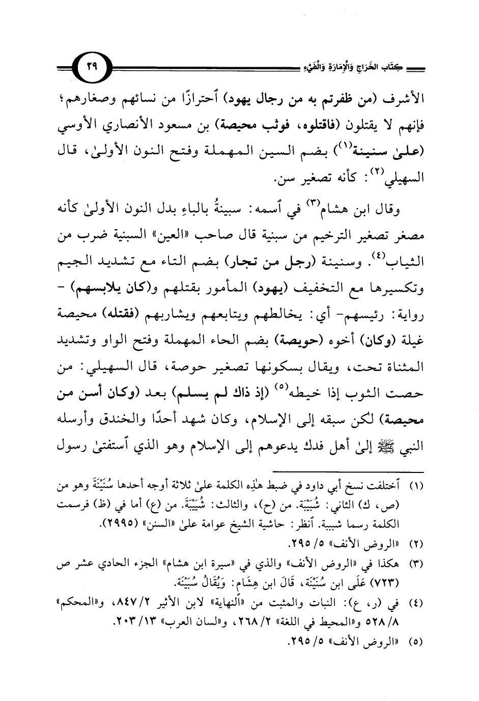 (¬3) هكذا في "الروض الأنف" والذي في "سيرة ابن هشام" الجزء الحادي عشر ص (723) عَلَى ابن سُنَيْنَة، قَالَ ابن هِشَامٍ: وَيُقَالُ سُبَيْنَة.