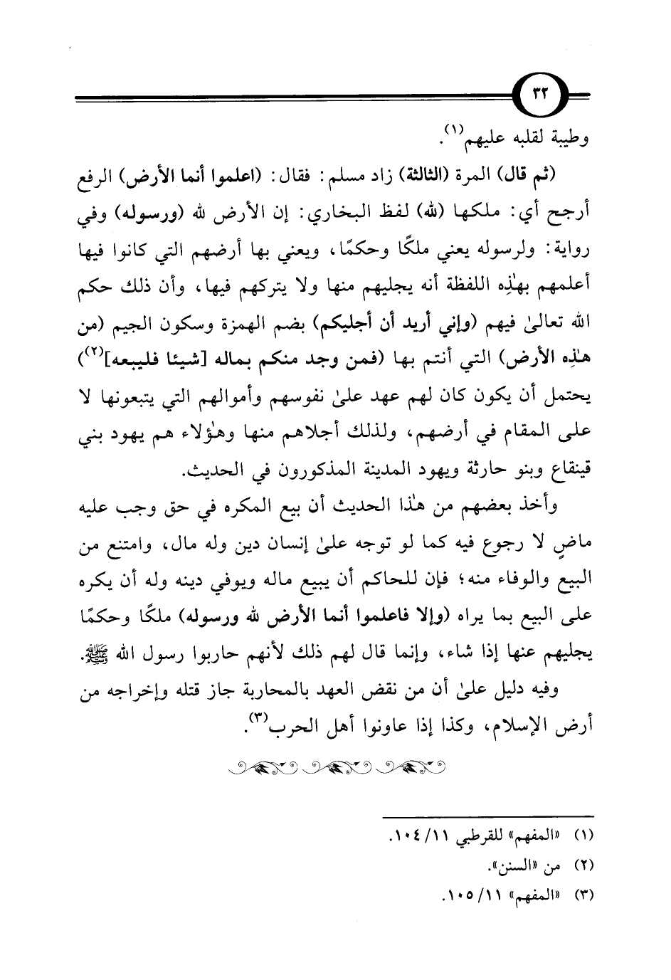 (ثم قال) المرة (الثالثة) زاد مسلم: فقال: (اعلموا أنما الأرض) الرفع أرجح أي: ملكها (لله) لفظ البخاري: إن الأرض لله (ورسوله) وفي رواية: ولرسوله يعني ملكًا وحكمًا، ويعني بها أرضهم التي كانوا فيها أعلمهم بهذِه اللفظة أنه يجليهم منها ولا يتركهم فيها، وأن ذلك حكم الله تعالى فيهم (وإني أريد أن أجليكم) بضم الهمزة وسكون الجيم (من هذِه الأرض) التي أنتم بها (فمن وجد منكم بماله [شيئا فليبعه]) (¬2) يحتمل أن يكون كان لهم عهد على نفوسهم وأموالهم التي يتبعونها لا على المقام في أرضهم، ولذلك أجلاهم منها وهؤلاء هم يهود بني قينقاع وبنو حارثة ويهود المدينة المذكورون في الحديث.