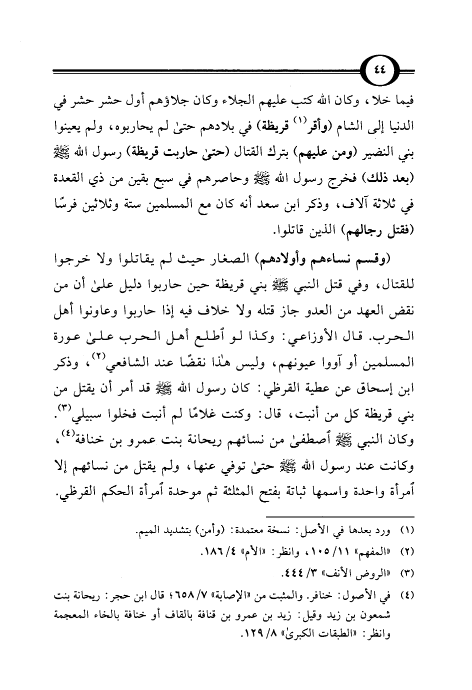 فيما خلا، وكان الله كتب عليهم الجلاء وكان جلاؤهم أول حشر حشر في الدنيا إلى الشام (وأقر (¬1) قريظة) في بلادهم حتى لم يحاربوه، ولم يعينوا بني النضير (ومن عليهم) بترك القتال (حتى حاربت قريظة) رسول الله - صلى الله عليه وسلم - (بعد ذلك) فخرج رسول الله - صلى الله عليه وسلم - وحاصرهم في سبع بقين من ذي القعدة في ثلاثة آلاف، وذكر ابن سعد أنه كان مع المسلمين ستة وثلاثين فرسًا (فقتل رجالهم) الذين قاتلوا.