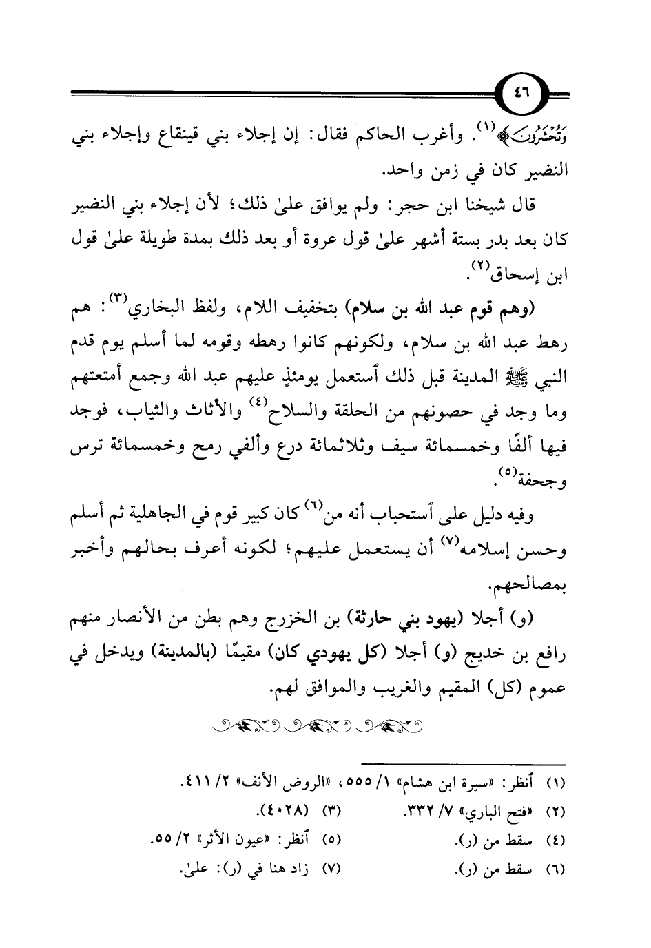 (وهم قوم عبد الله بن سلام) بتخفيف اللام، ولفظ البخاري (¬3): هم رهط عبد الله بن سلام، ولكونهم كانوا رهطه وقومه لما أسلم يوم قدم النبي - صلى الله عليه وسلم - المدينة قبل ذلك استعمل يومئذٍ عليهم عبد الله وجمع أمتعتهم وما وجد في حصونهم من الحلقة والسلاح (¬4) والأثاث والثياب، فوجد فيها ألفًا وخمسمائة سيف وثلاثمائة درع وألفي رمح وخمسمائة ترس وجحفة (¬5).