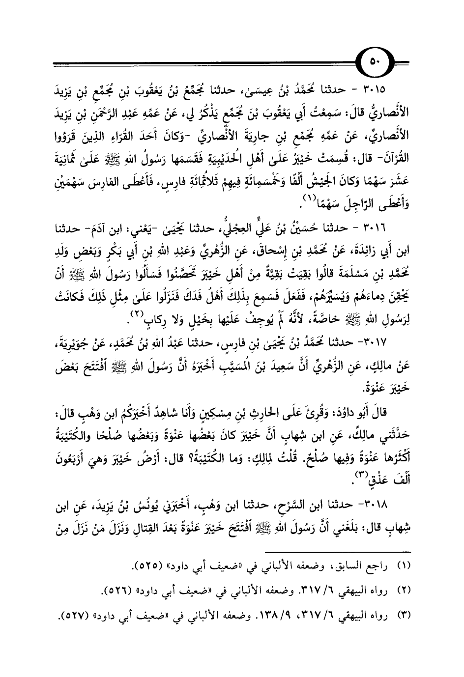 3015 - حدثنا محَمَّد بْنُ عِيسَى، حدثنا مجَمِّعُ بْن يَعْقوبَ بْنِ مُجَمِّعِ بْنِ يَزِيدَ الأنصاريُّ قالَ: سَمِعْتُ أبي يَعْقوبَ بْنَ مجَمِّع يَذْكُرُ لي، عَنْ عَمِّهِ عَبْدِ الرَّحْمَنِ بْنِ يَزِيدَ الأنصاريِّ، عَنْ عَمِّهِ مُجَمِّعِ بْنِ جارِيَةَ الأنْصاريِّ -وَكانَ أَحَدَ القرّاءِ الذِينَ قَرَؤوا القُرآنَ- قال: قسِمَتْ خَيْبر عَلَى أَهْلِ الحدَيْبِيَةِ فَقَسَمَها رَسُول اللهِ - صلى الله عليه وسلم - عَلَى ثَمانِيَة عَشَرَ سَهْمًا وَكانَ الجَيْشُ ألفًا وَخَمْسَمِائَةٍ فِيهِمْ ثَلاثُمِائَةِ فارِسٍ، فَأَعطى الفارِسَ سَهْمَيْنِ وَأَعْطَى الرّاجِلَ سَهْمًا (¬1).