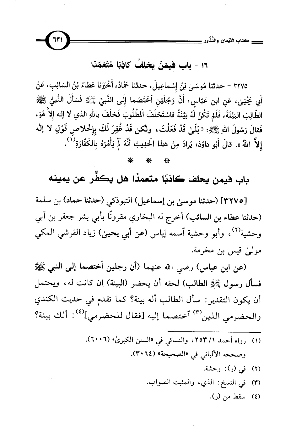 3275 - حدثنا مُوسَى بْن إِسْماعِيلَ، حدثنا حَمّادٌ، أَخْبَرَنا عَطَاءُ بْن السّائِبِ، عَنْ أَبي يحيى، عَنِ ابن عَبّاسٍ: أَنَّ رَجُلَينِ اخْتَصَما إِلَى النَّبيِّ - صلى الله عليه وسلم - فَسَأَلَ النَّبيُّ الطّالِبَ البَيِّنَةَ، فَلَمْ تَكُنْ لَه بَيِّنَةٌ فاسْتَحْلَفَ المَطْلُوبَ فَحَلَفَ باللهِ الذي لا إله إِلا هُوَ، فَقالَ رَسُولُ اللهِ - صلى الله عليه وسلم -: "بَلَى قَدْ فَعَلْتَ، ولكن قَدْ غُفِرَ لَكَ بِإخلاصِ قَوْلِ لا إله إِلاَّ اللهُ". قالَ أبو داوُدَ: يُرادُ مِنْ هذا الحَدِيثِ أَنَّهُ, يَأْمُرْهُ بِالكَفّارَةِ (¬1).
