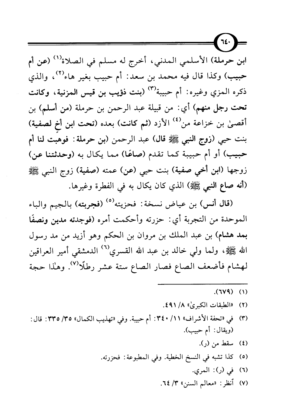 ابن حرملة) الأسلمي المدني، أخرج له مسلم في الصلاة (¬1) (عن أم حبيب) وكذا قال فيه محمد بن سعد: أم حبيب بغير هاء (¬2)، والذي ذكره المزي وغيره: أم حبيبة (¬3) (بنت ذؤيب بن قيس المزنية، وكانت تحت رجل منهم) أي: من قبيلة عبد الرحمن بن حرملة (من أسلم) بن أقصى بن خزاعة من (¬4) الأزد (ثم كانت) بعده (تحت ابن أخٍ لصفية) بنت حيي (زوج النبي - صلى الله عليه وسلم - قال) عبد الرحمن (بن حرملة: فوهبت لنا أم حبيب) أو أم حبيبة كما تقدم (صاعًا) مما يكال به (وحدثتنا عن) زوجها (ابن أخي صفية) بنت حيي (عن) عمته (صفية) زوج النبي - صلى الله عليه وسلم - (أنه صاع النبي - صلى الله عليه وسلم -) الذي كان يكال به في الفطرة وغيرها.