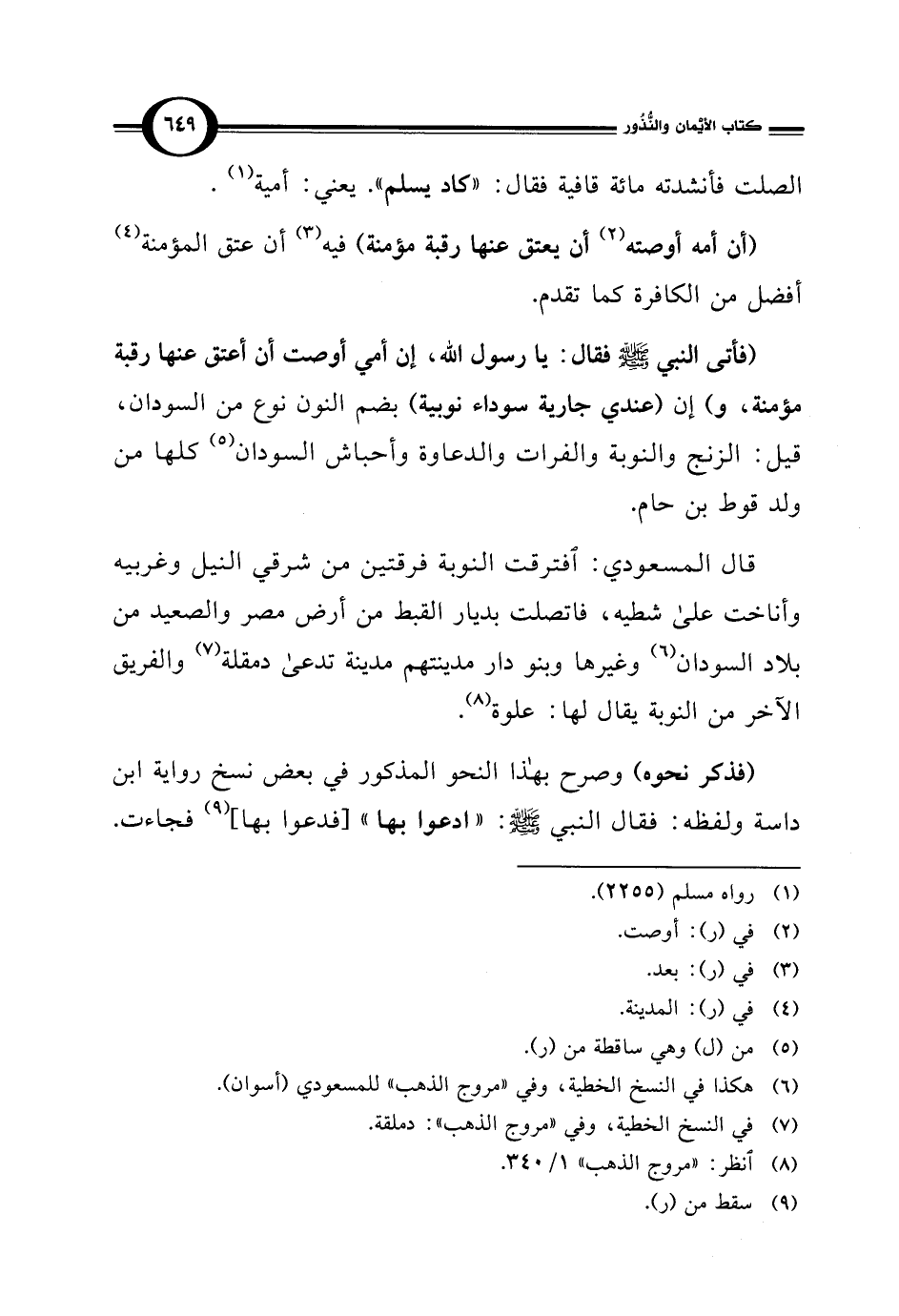 (فأتى النبي - صلى الله عليه وسلم - فقال: يا رسول الله، إن أمي أوصت أن أعتق عنها رقبة مؤمنة، و) إن (عندي جارية سوداء نوبيه) بضم النون نوع من السودان، قيل: الزنج والنوبة والفرات والدعاوة وأحباش السودان (¬5) كلها من ولد قوط بن حام.