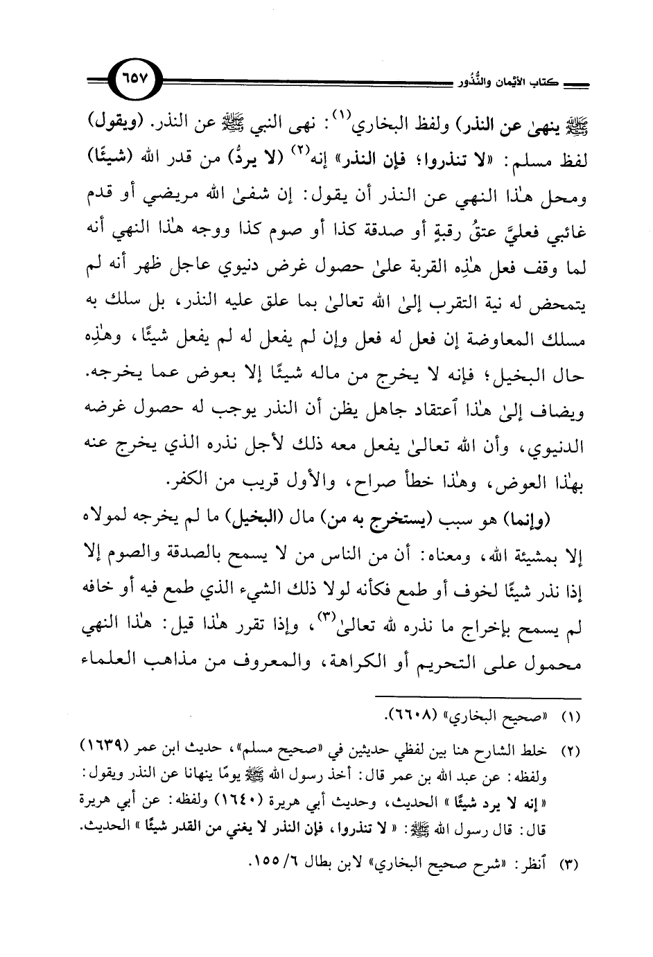 (وإنما) هو سبب (يستخرج به من) مال (البخيل) ما لم يخرجه لمولاه إلا بمشيئة الله، ومعناه: أن من الناس من لا يسمح بالصدقة والصوم إلا إذا نذر شيئًا لخوف أو طمع فكأنه لولا ذلك الشيء الذي طمع فيه أو خافه لم يسمح بإخراج ما نذره لله تعالى (¬3)، وإذا تقرر هذا قيل: هذا النهي محمول على التحريم أو الكراهة، والمعروف من مذاهب العلماء