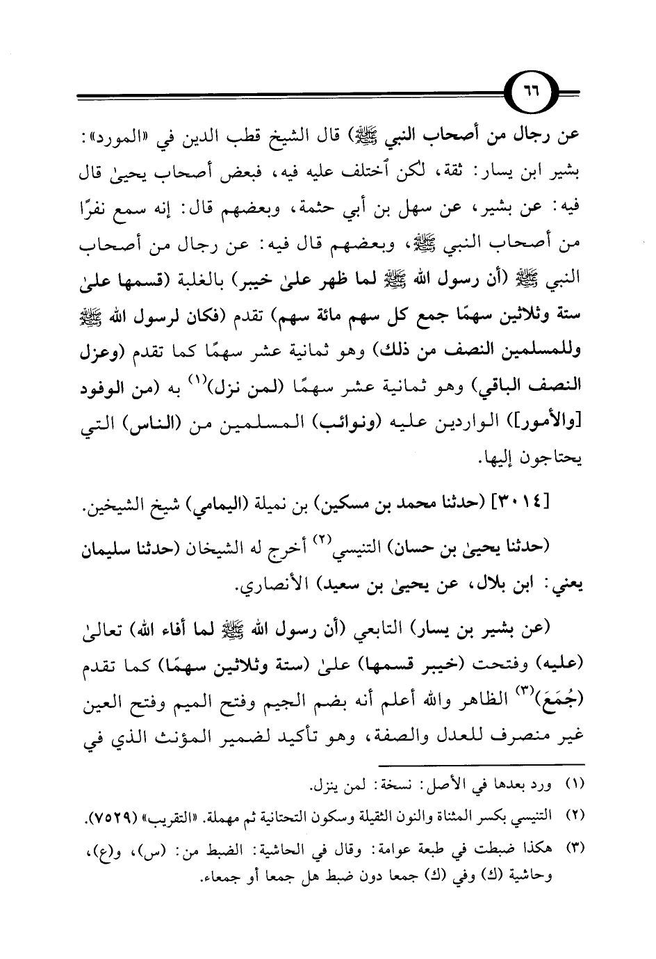 (عن بشير بن يسار) التابعي (أن رسول الله - صلى الله عليه وسلم - لما أفاء الله) تعالى (عليه) وفتحت (خيبر قسمها) على (ستة وثلاثين سهفا) كما تقدم (جُمَعَ) (¬3) الظاهر والله أعلم أنه بضم الجيم وفتح الميم وفتح العين غير منصرف للعدل والصفة، وهو تأكيد لضمير المؤنث الذي في