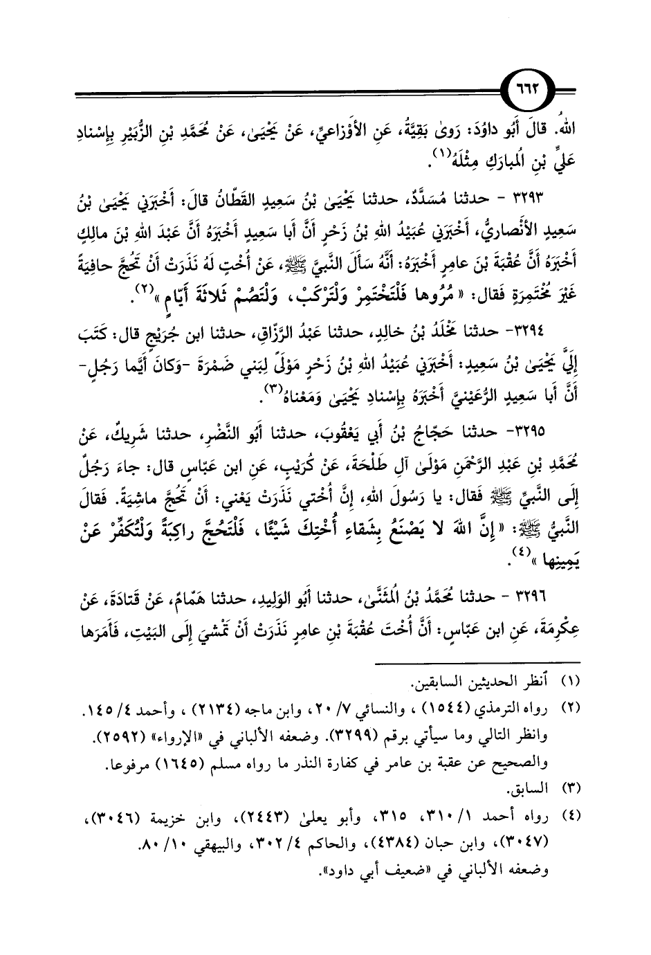 3293 - حدثنا مُسَدَّدٌ، حدثنا يَحْيَى بْنُ سَعِيدٍ القَطّانُ قالَ: أَخْبَرَني يَحْيَى بْنُ سَعِيدٍ الأَنْصاريُّ، أَخْبَرَني عُبَيْدُ اللهِ بْنُ زَحْرٍ أَنَّ أَبا سَعِيدٍ أَخْبَرَهُ أَنَّ عَبْدَ اللهِ بْنَ مالِكٍ أَخْبَرَهُ أَنَّ عُقْبَةَ بْنَ عامِرٍ أَخْبَرَهُ: أنَّهُ سَأَلَ النَّبيَّ - صلى الله عليه وسلم -، عَنْ أُخْتٍ لَهُ نَذَرَتْ أَنْ تَحُجَّ حافِيَة غَيْرَ مُخْتَمِرَةٍ فَقال: "مُرُوها فَلْتَخْتَمِرْ وَلْتَرْكَبْ، وَلْتَصُمْ ثَلاثَةَ أَيّامٍ" (¬2).