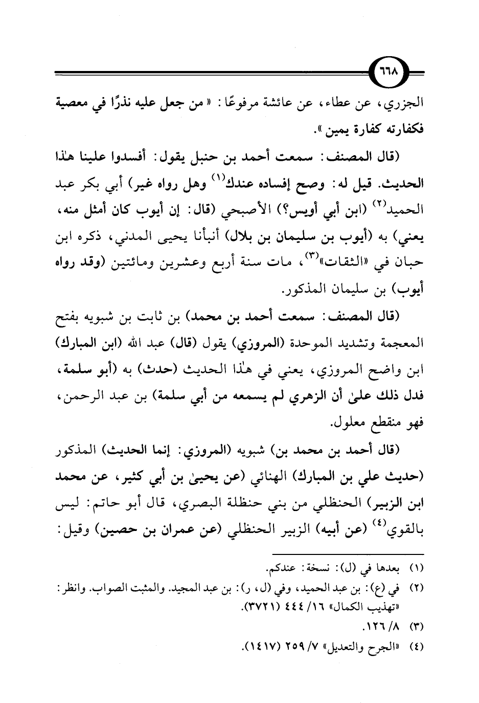 (قال المصنف: سمعت أحمد بن حنبل يقول: أفسدوا علينا هذا الحديث. قيل له: وصح إفساده عندك (¬1) وهل رواه غير) أبي بكر عبد الحميد (¬2) (ابن أبي أويس؟ ) الأصبحي (قال: إن أيوب كان أمثل منه، يعني) به (أيوب بن سليمان بن بلال) أنبأنا يحيى المدني، ذكره ابن حبان في "الثقات" (¬3)، مات سنة أربع وعشرين ومائتين (وقد رواه أيوب) بن سليمان المذكور.