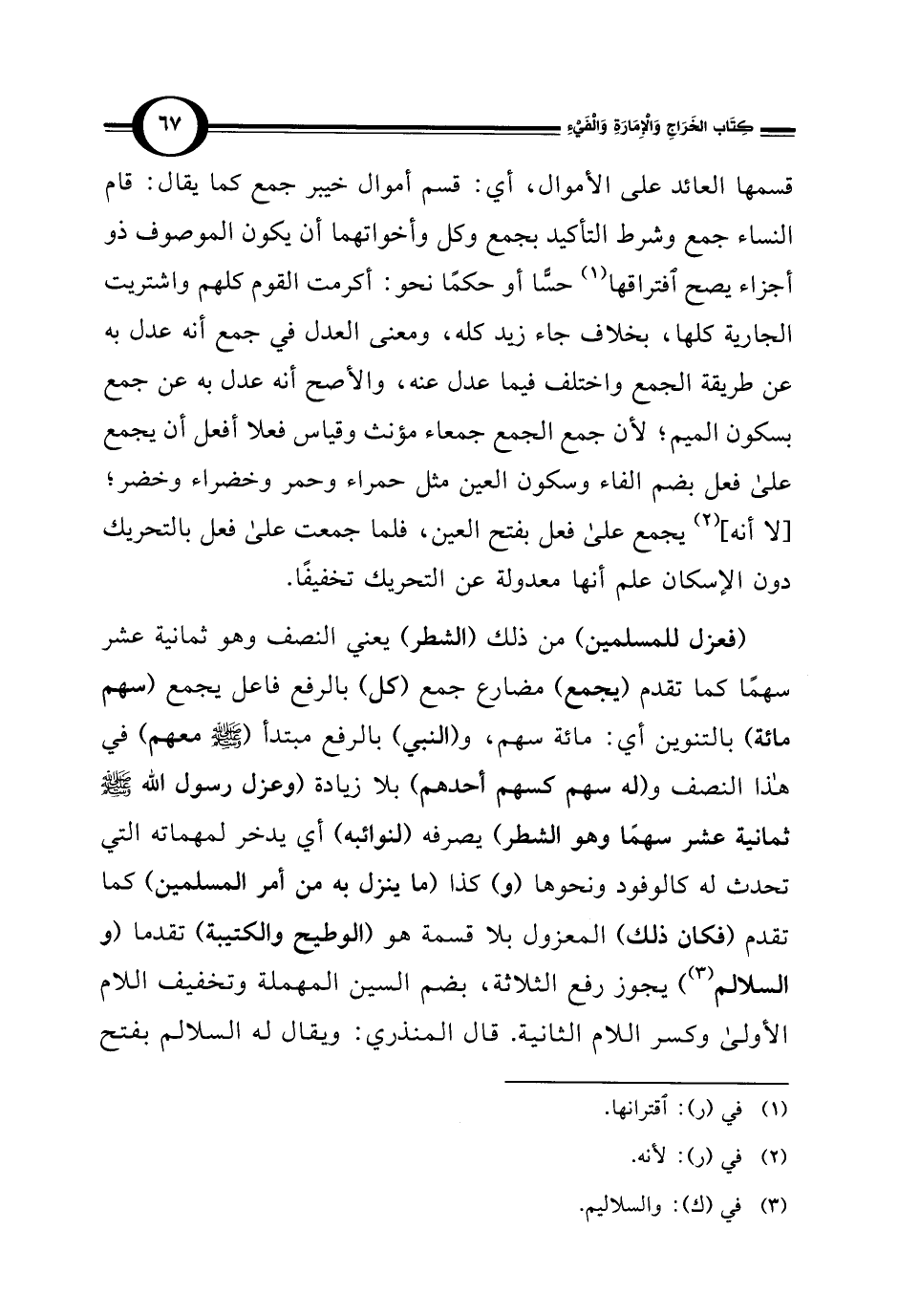 (فعزل للمسلمين) من ذلك (الشطر) يعني النصف وهو ثمانية عشر سهمًا كما تقدم (يجمع) مضارع جمع (كل) بالرفع فاعل يجمع (سهم مائة) بالتنوين أي: مائة سهم، و (النبي) بالرفع مبتدأ (- صلى الله عليه وسلم - معهم) في هذا النصف واله سهم كسهم أحدهم) بلا زيادة (وعزل رسول الله - صلى الله عليه وسلم - ثمانية عشر سهمًا وهو الشطر) يصرفه (لنوائبه) أي يدخر لمهماته التي تحدث له كالوفود ونحوها (و) كذا (ما ينزل به من أمر المسلمين) كما تقدم (فكان ذلك) المعزول بلا قسمة هو (الوطيح والكتيبة) تقدما (والسلالم) (¬3) يجوز رفع الثلاثة، بضم السين المهملة وتخفيف اللام الأولى وكسر اللام الثانية. قال المنذري: ويقال له السلالم بفتح