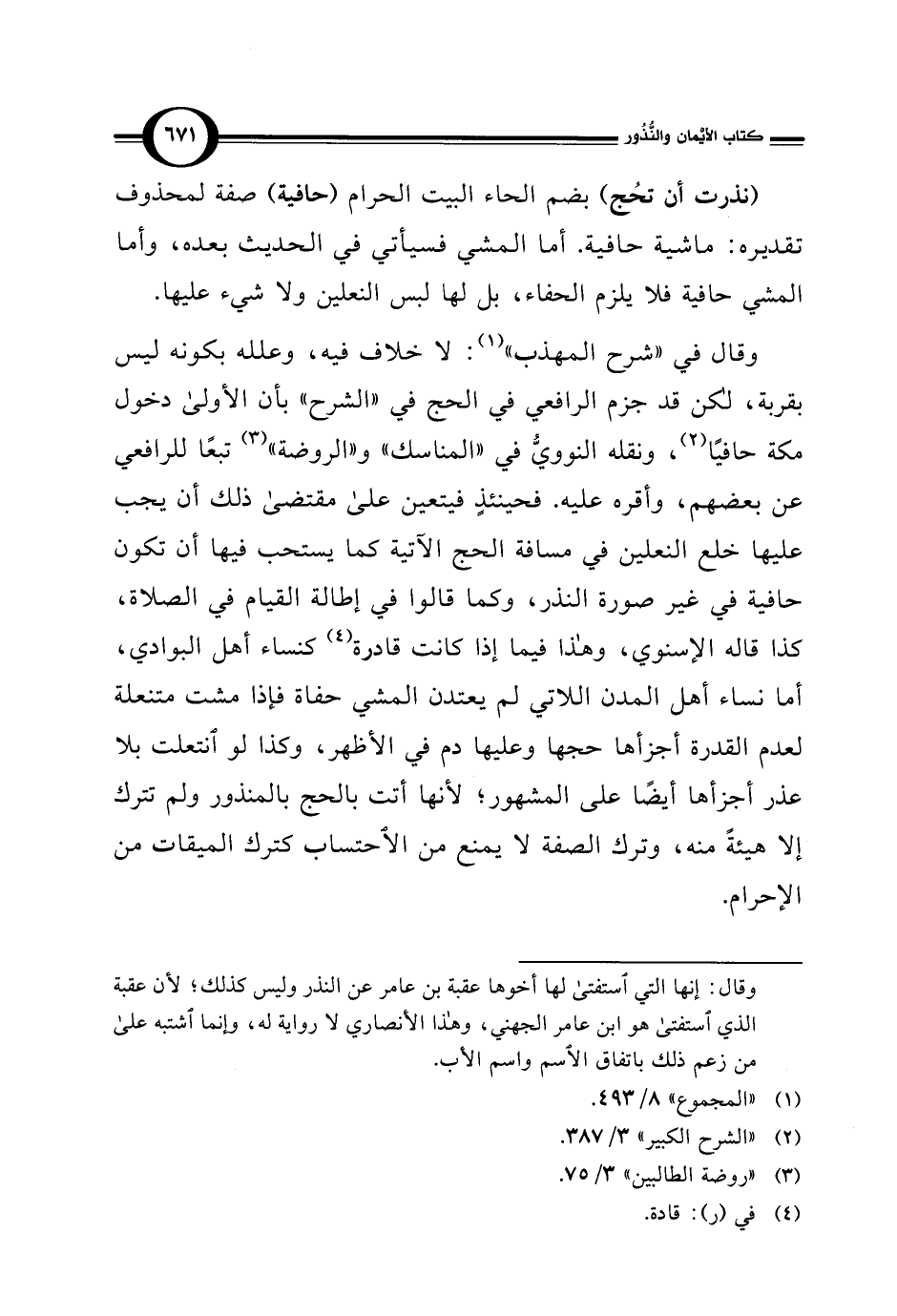 وقال في "شرح المهذب" (¬1): لا خلاف فيه، وعلله بكونه ليس بقربة، لكن قد جزم الرافعي في الحج في "الشرح" بأن الأولى دخول مكة حافيًا (¬2)، ونقله النوويُّ في "المناسك" و"الروضة" (¬3) تبعًا للرافعي عن بعضهم، وأقره عليه. فحينئذٍ فيتعين على مقتضى ذلك أن يجب عليها خلع النعلين في مسافة الحج الآتية كما يستحب فيها أن تكون حافية في غير صورة النذر، وكما قالوا في إطالة القيام في الصلاة، كذا قاله الإسنوي، وهذا فيما إذا كانت قادرة (¬4) كنساء أهل البوادي، أما نساء أهل المدن اللاتي لم يعتدن المشي حفاة فإذا مشت متنعلة لعدم القدرة أجزأها حجها وعليها دم في الأظهر، وكذا لو انتعلت بلا عذر أجزأها أيضًا على المشهور؛ لأنها أتت بالحج بالمنذور ولم تترك إلا هيئةً منه، وترك الصفة لا يمنع من الاحتساب كترك الميقات من الإحرام.