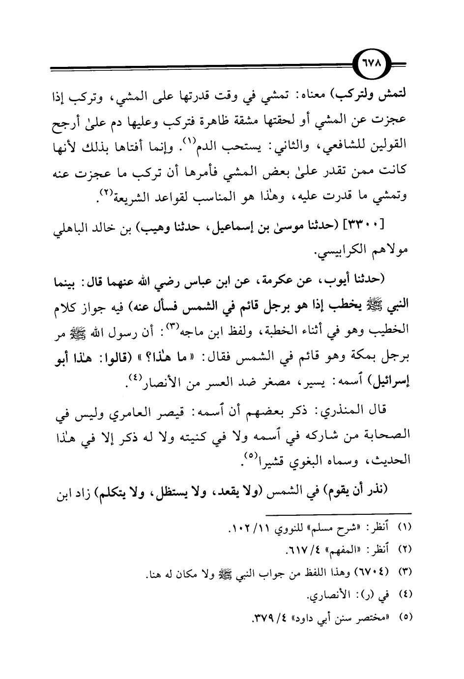 (حدثنا أيوب، عن عكرمة، عن ابن عباس رضي الله عنهما قال: بينما النبي - صلى الله عليه وسلم - يخطب إذا هو برجل قائم في الشمس فسأل عنه) فيه جواز كلام الخطيب وهو في أثناء الخطبة، ولفظ ابن ماجه (¬3): أن رسول الله - صلى الله عليه وسلم - مر برجل بمكة وهو قائم في الشمس فقال: " ما هذا؟ " (قالوا: هذا أبو إسرائيل) اسمه: يسير، مصغر ضد العسر من الأنصار (¬4).
