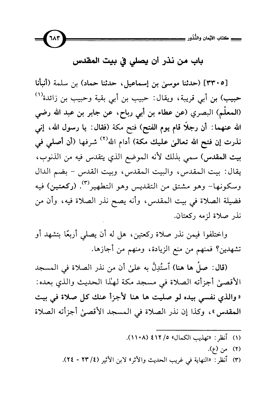 [3305] (حدثنا موسى بن إسماعيل، حدثنا حماد) بن سلمة (أنبأنا حبيب) بن أبي قريبة، ويقال: حبيب بن أبي بقية وحبيب بن زائدة (¬1) (المعلِّم) البصري (عن عطاء بن أبي رباح، عن جابر بن عبد الله رضي الله عنهما: أن رجلًا قام يوم الفتح) فتح مكة (فقال: يا رسول الله، إني نذرت إن فتح الله تعالى عليك مكة) أدام الله (¬2) شرفها (أن أصلي في بيت المقدس) سمي بذلك لأنه الموضع الذي يتقدس فيه من الذنوب، يقال: بيت المقدس، والبيت المقدس، وبيت القدس -بضم الدال وسكونها- وهو مشتق من التقديس وهو التطهير (¬3). (ركعتين) فيه فضيلة الصلاة في بيت المقدس، وأنه يصح نذر الصلاة فيه، وأن من نذر صلاة لزمه ركعتان.