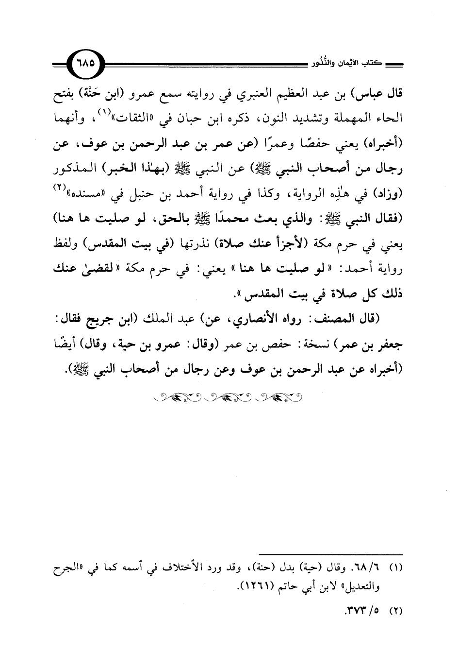 قال عباس) بن عبد العظيم العنبري في روايته سمع عمرو (ابن حَنَّة) بفتح الحاء المهملة وتشديد النون، ذكره ابن حبان في "الثقات" (¬1)، وأنهما (أخبراه) يعني حفصا وعمرًا (عن عمر بن عبد الرحمن بن عوف، عن رجال من أصحاب النبي - صلى الله عليه وسلم -) عن النبي - صلى الله عليه وسلم - (بهذا الخبر) المذكور (وزاد) في هذِه الرواية، وكذا في رواية أحمد بن حنبل في "مسنده" (¬2) (فقال النبي - صلى الله عليه وسلم -: والذي بعث محمدًا - صلى الله عليه وسلم - بالحق، لو صليت ها هنا) يعني في حرم مكة (لأجزأ عنك صلاة) نذرتها (في بيت المقدس) ولفظ رواية أحمد: "لو صليت ها هنا" يعني: في حرم مكة "لقضى عنك ذلك كل صلاة في بيت المقدس".