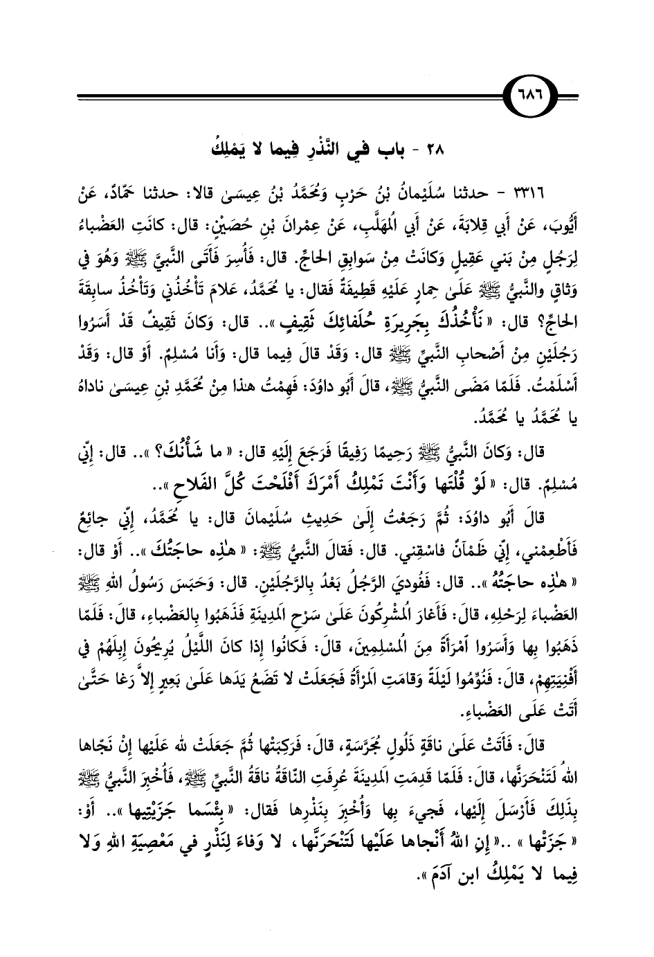 3316 - حدثنا سُلَيْمان بْن حَرْبٍ وَمحَمَّدُ بْن عِيسَى قالا: حدثنا حَمّادٌ، عَنْ أَيُّوبَ، عَنْ أَبِي قِلابَةَ، عَنْ أَبِي المُهَلَّبِ، عَنْ عِمْرانَ بْنِ حُصَيْنٍ: قال: كانَتِ العَضْباءُ لِرَجُلٍ مِنْ بَني عَقِيل وَكانَتْ مِنْ سَوابِقِ الحاجِّ. قال: فَأُسِرَ فَأَتَى النَّبيَّ - صلى الله عليه وسلم - وَهُوَ في وَثاقٍ والنَّبي - صلى الله عليه وسلم - عَلَى حِمارٍ عَلَيْهِ قَطِيفَةٌ فَقال: يا مُحَمَّدُ، عَلامَ تَأْخذُني وَتَأْخذُ سابِقَةَ الحاجِّ؟ قال: " نَأْخُذُكَ بِجَرِيرَةِ حُلَفائِكَ ثَقِيفٍ " .. قال: وَكانَ ثَقِيفٌ قَدْ أَسَرُوا رَجُلَيْنِ مِنْ أَصْحابِ النَّبيِّ - صلى الله عليه وسلم - قال: وَقَدْ قالَ فِيما قال: وَأَنا مُسْلِمٌ. أَوْ قال: وَقَدْ أَسْلَمْت. فَلَمّا مَضَى النَّبيُّ - صلى الله عليه وسلم -، قالَ أَبُو داوُدَ: فَهِمْتُ هذا مِنْ محَمَّدِ بْنِ عِيسَى ناداهُ يا مُحَمَّد يا محَمَّد.