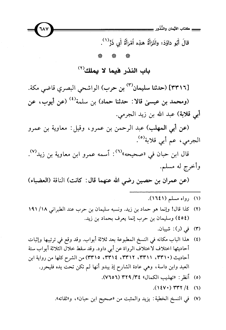 (¬4) هذا الباب مكانه في النسخ المطبوعة بعد ثلاثة أبواب. وقد وقع في ترتيبها وإثبات أحاديثها اختلاف لاختلاف الرواة عن أبي داود. وقد سقط خلال الثلاثة أبواب ستة أحاديث (3310، 3311، 3312، 3314، 3315) من الشرح كلها من رواية ابن العبد وابن داسة، وهي عادة الشارح إذ يبدو أنها لم تكن تحت يده فليحرر.